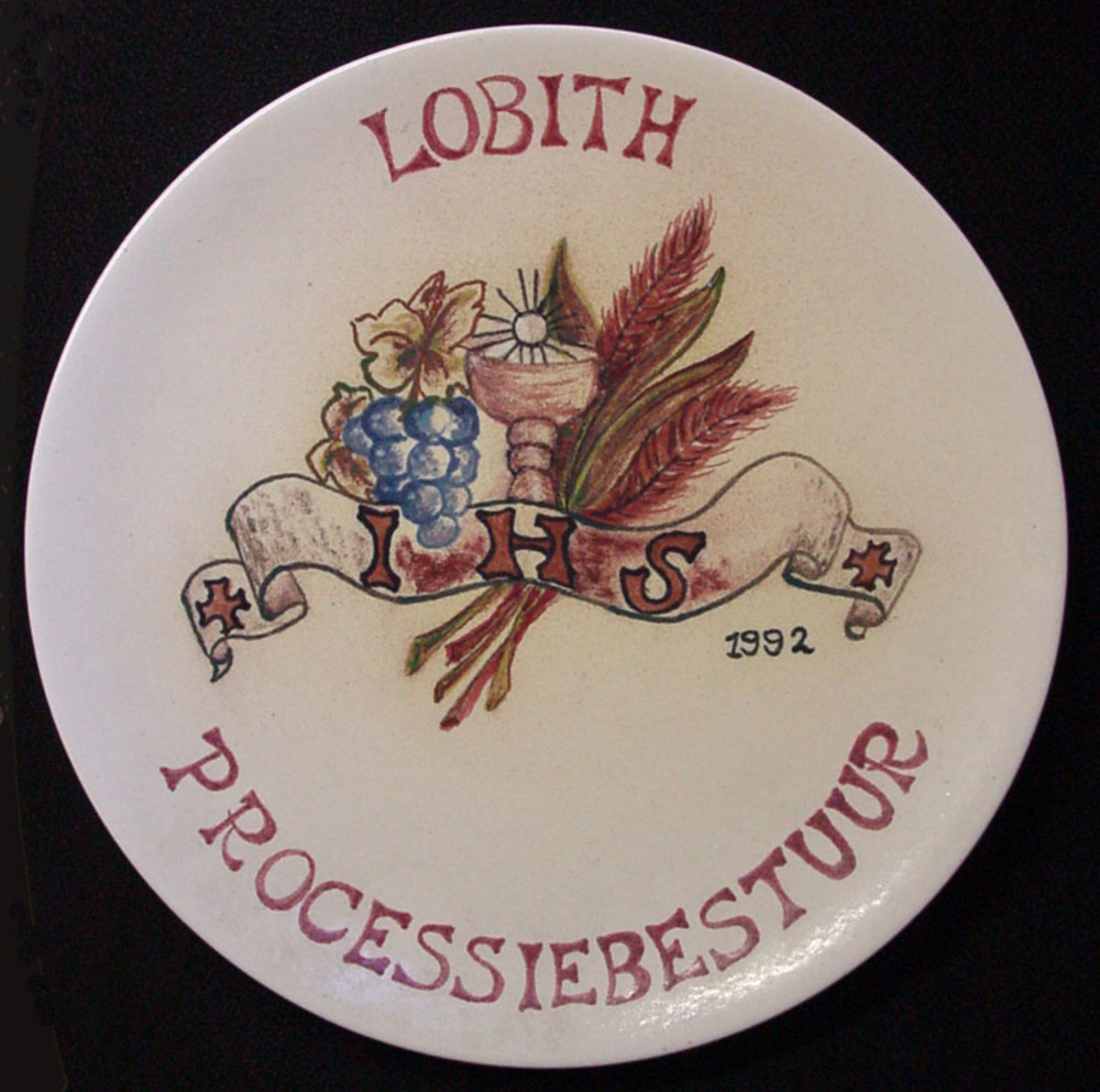 Wandbord van keramiek met de tekst Lobith Processieb...
