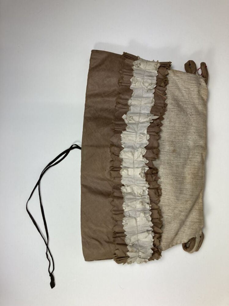 Muts van grijs linnen en bruine taftzijde, waarop wi...