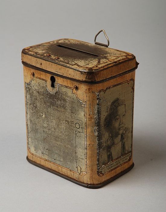 Rode spaarpot met kruis en de letters "M" en "H", va...
