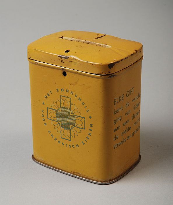 Okergele spaarpot met kruis en zonnebloem, spaarbusj...