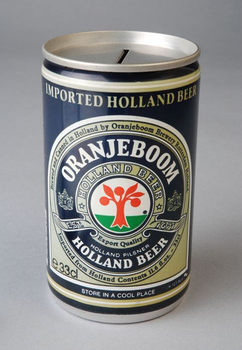 Donkerblauwe spaarpot met beeldmerk Oranjeboombier, ...