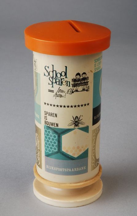 Witte spaarpot met symbolen en tekst "Rijkspostspaar...