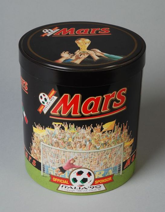 Geel cilindrisch blik met afbeelding van voetbal-doe...