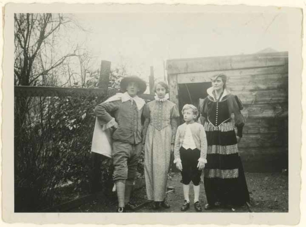 Foto, voorstellende familie Jansen, gekostumeerd t.g...