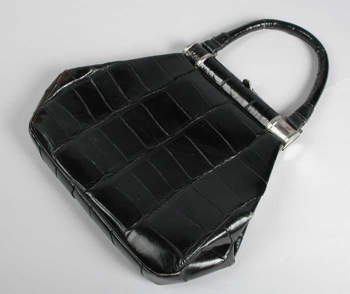 Trapeziumvormige handtas van zwart imitatie krokodil...