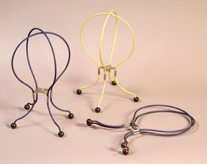 Twee blauwe en één gele hoedenstandaard