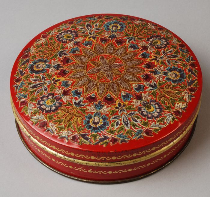 Rond blik met los deksel, "Droste", rood en veelkleurig