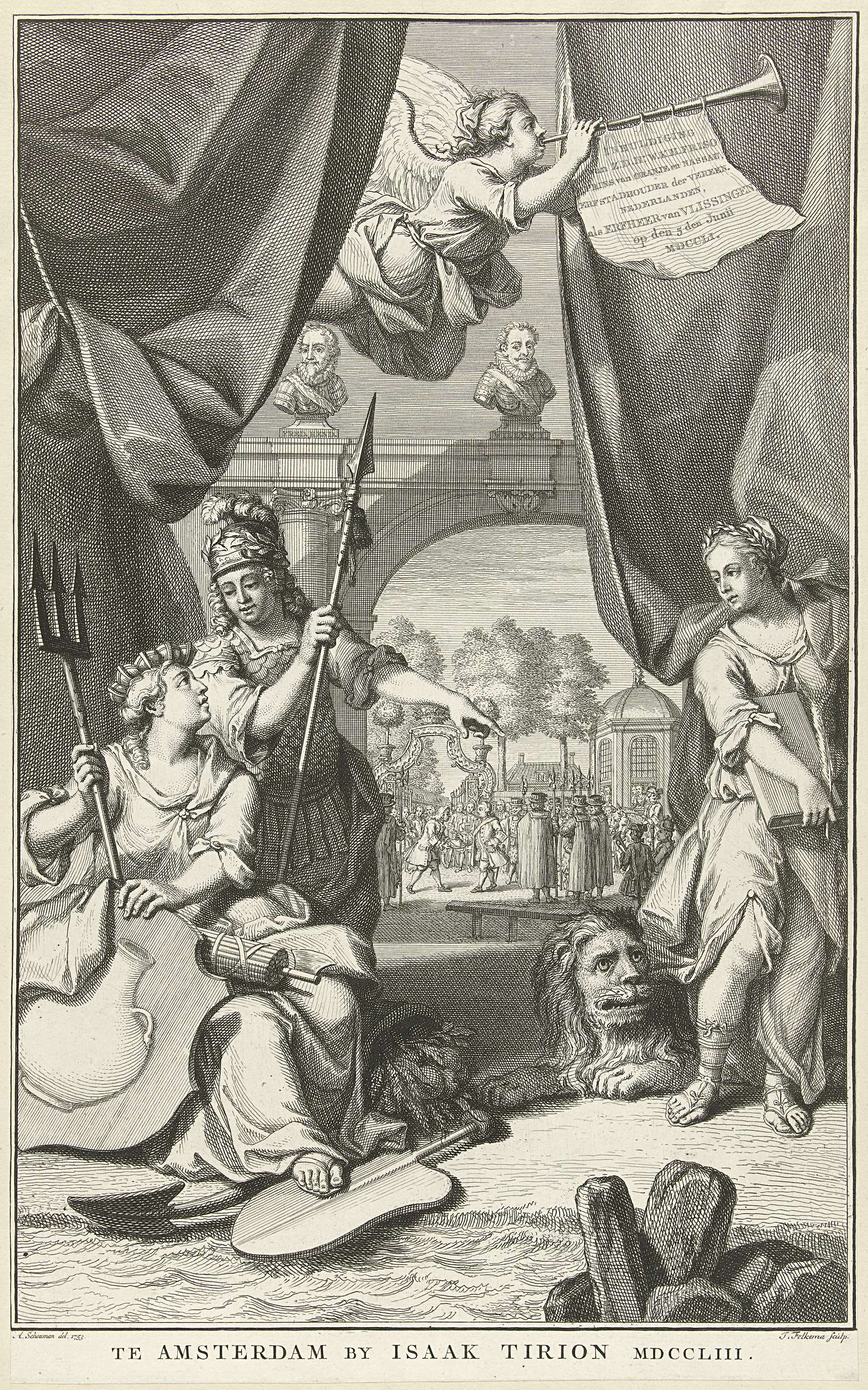 Allegorische titelplaat met het aanbieden van de sle...