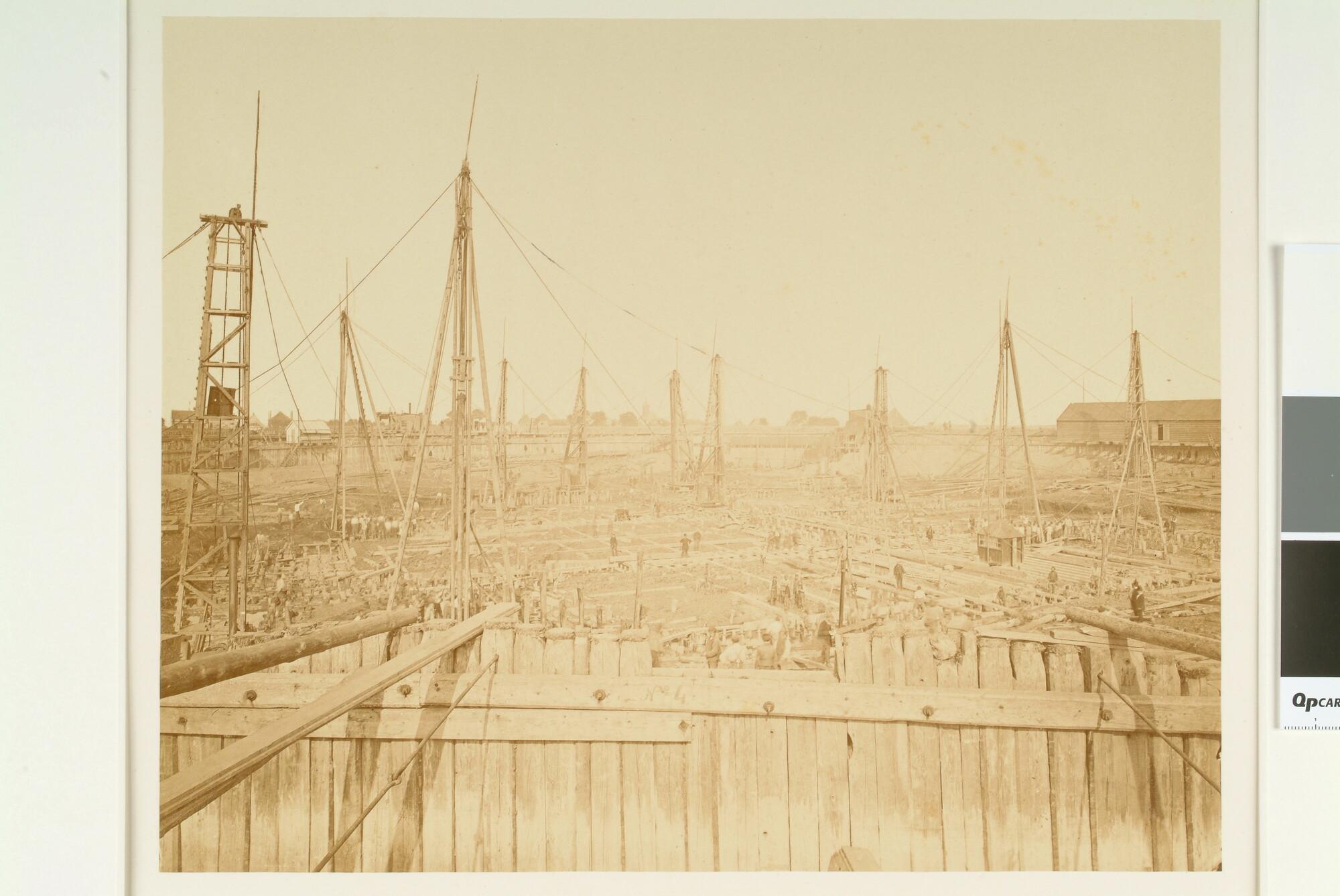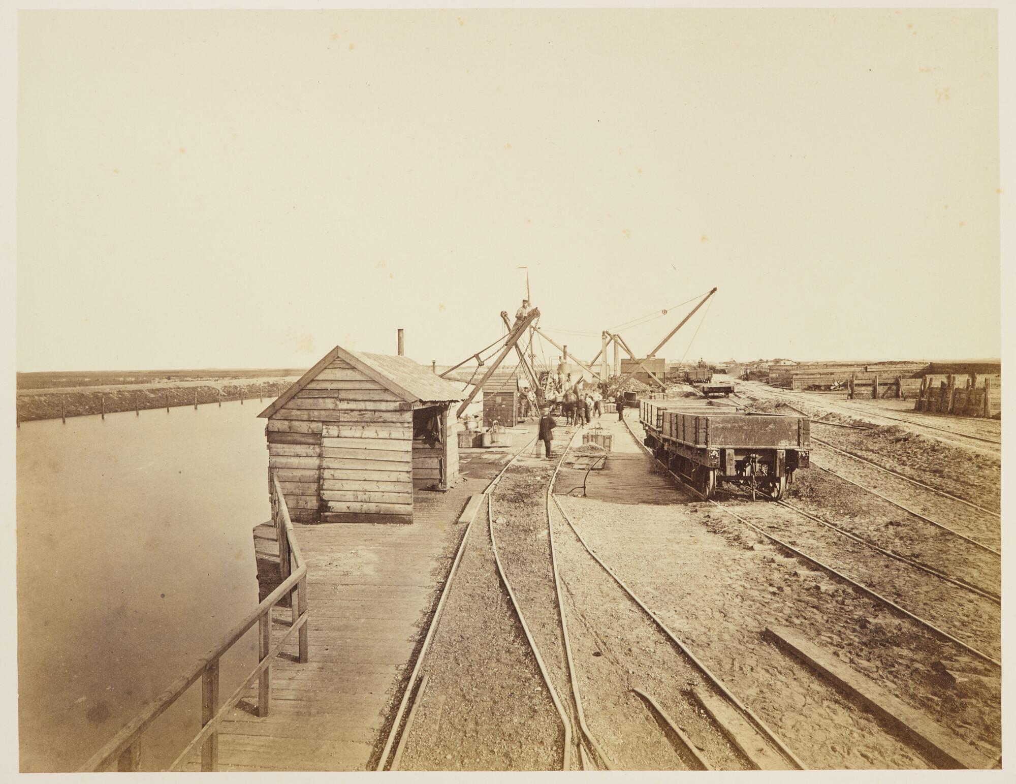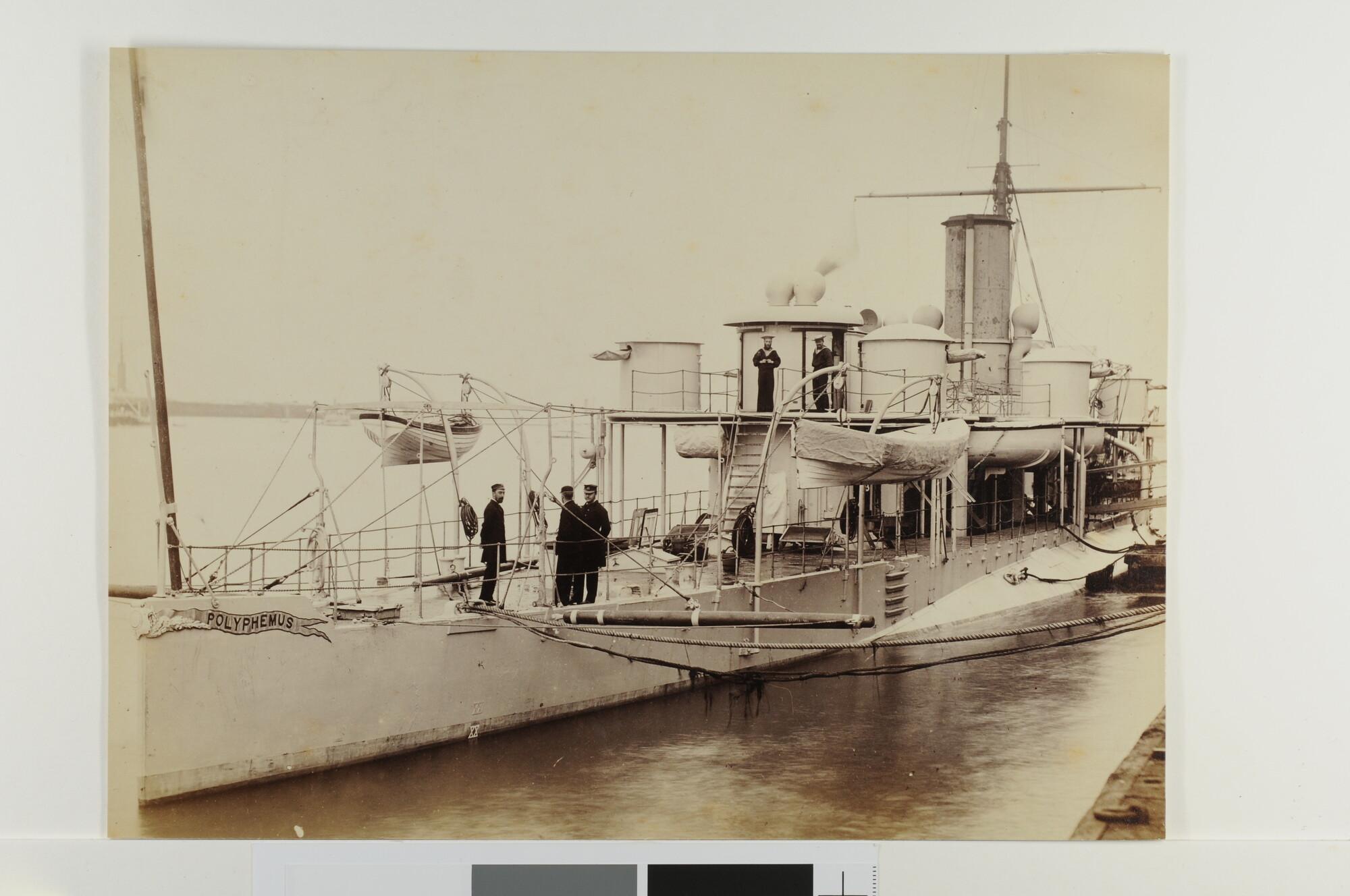 De Britse monitor Polyphemus afgemeerd aan een kade