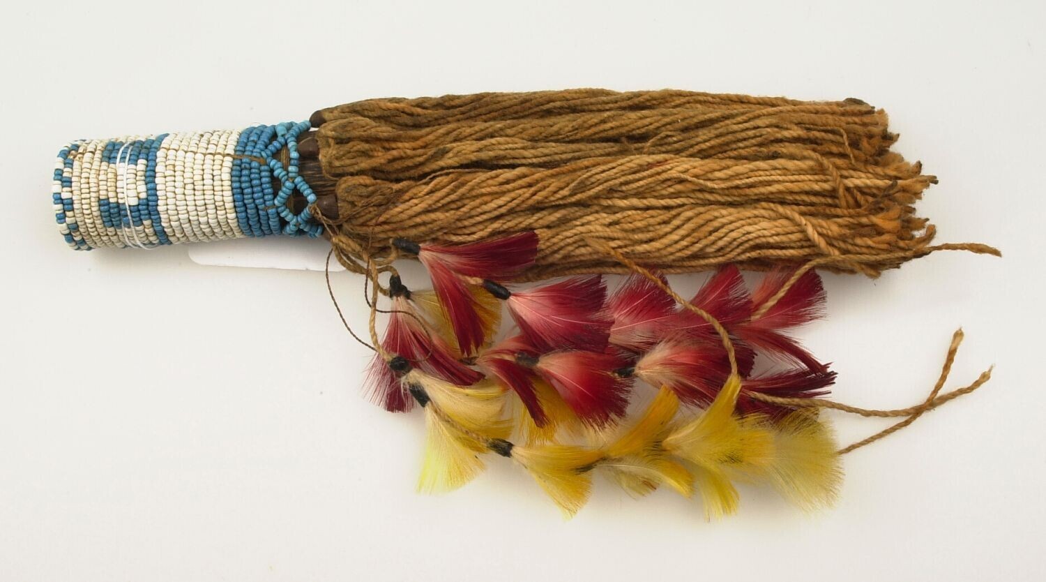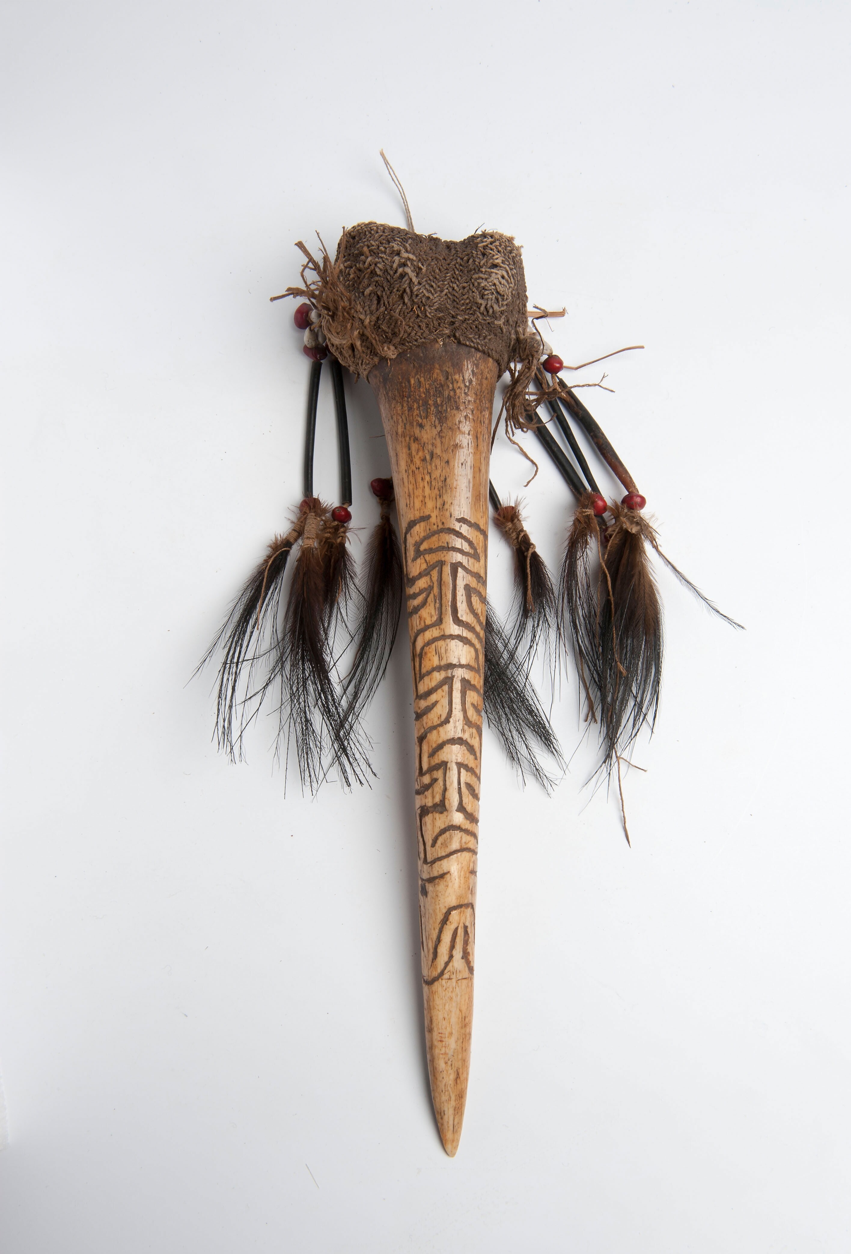 Peniskoker van kalebas met pluim van bont en veren