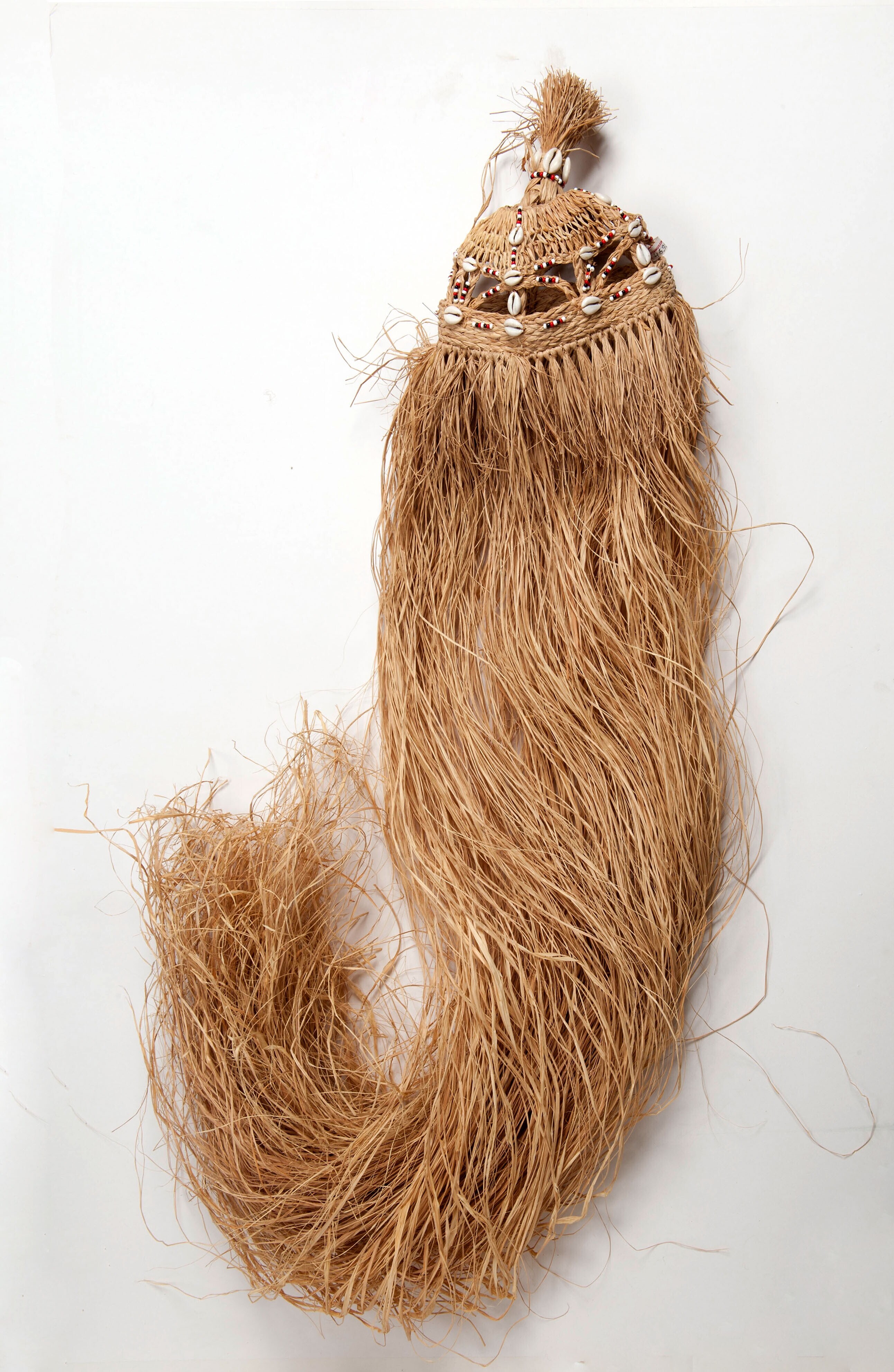 Hoofdbedekking met lange slierten raffia, onderdeel ...