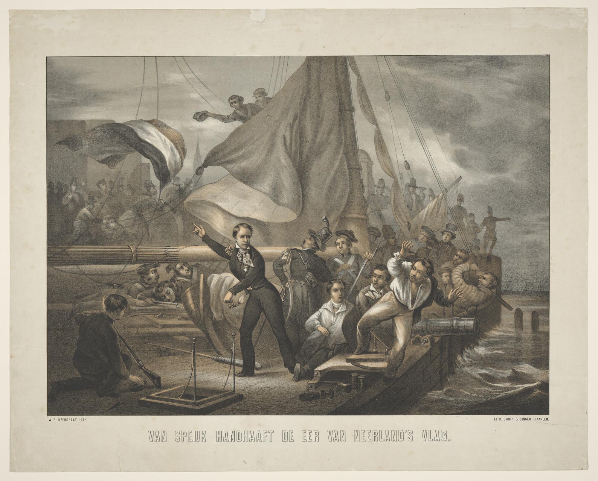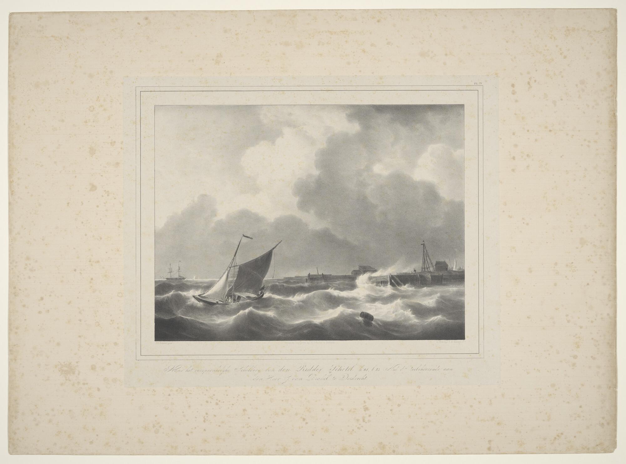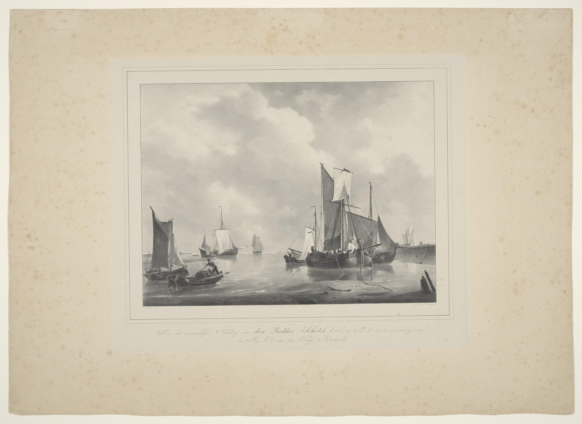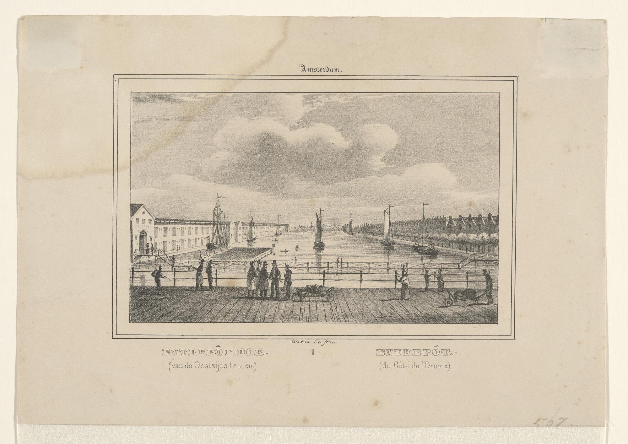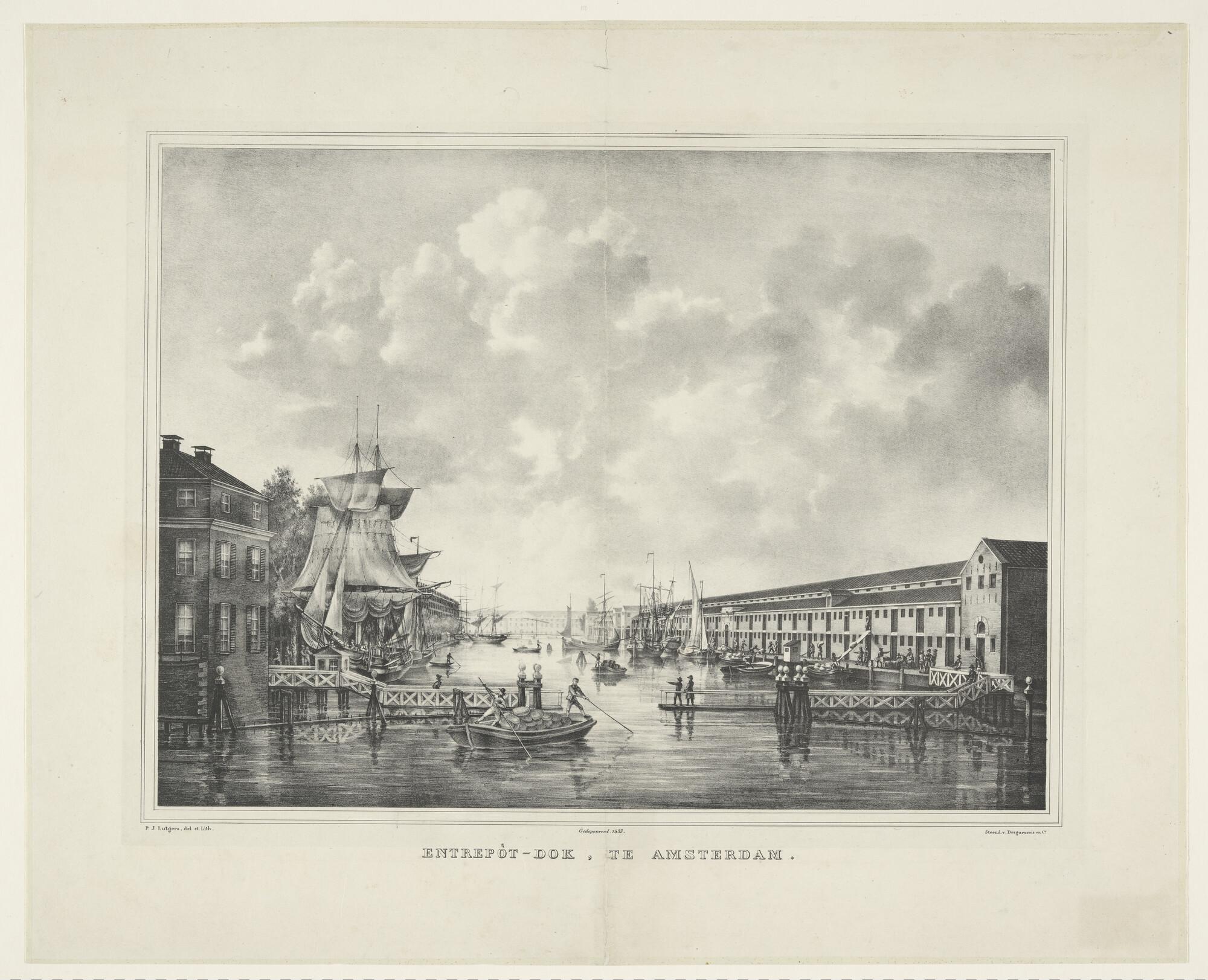 Lithografie van de haven van het Nieuwe Diep, met dr...