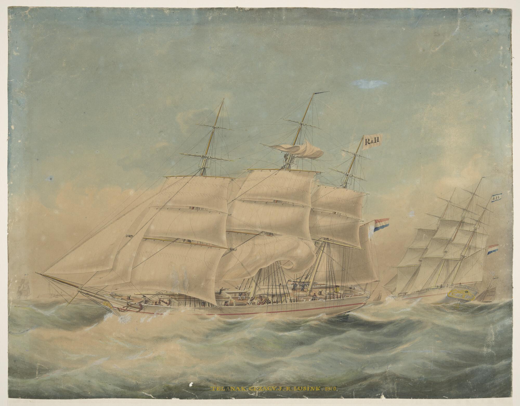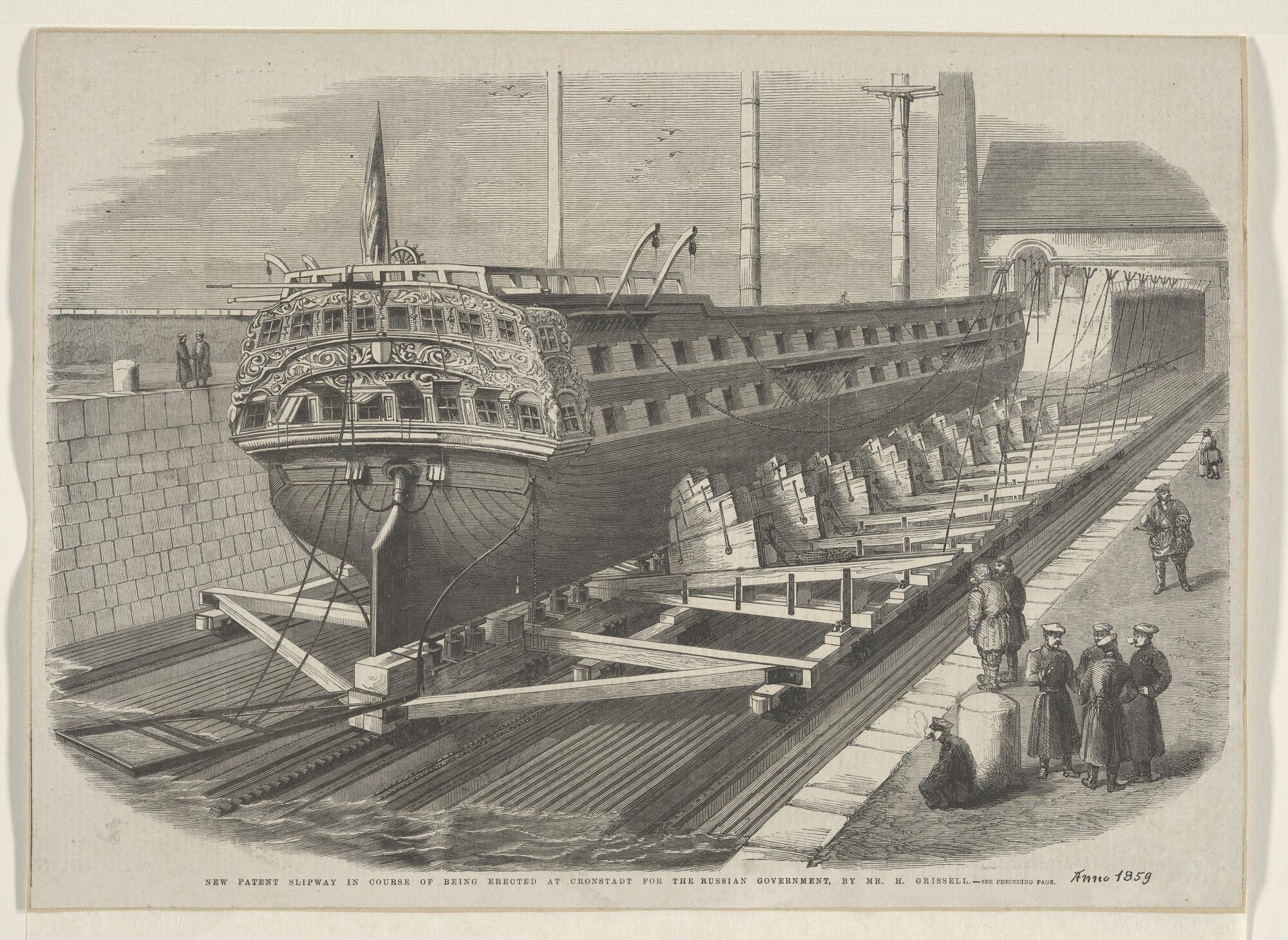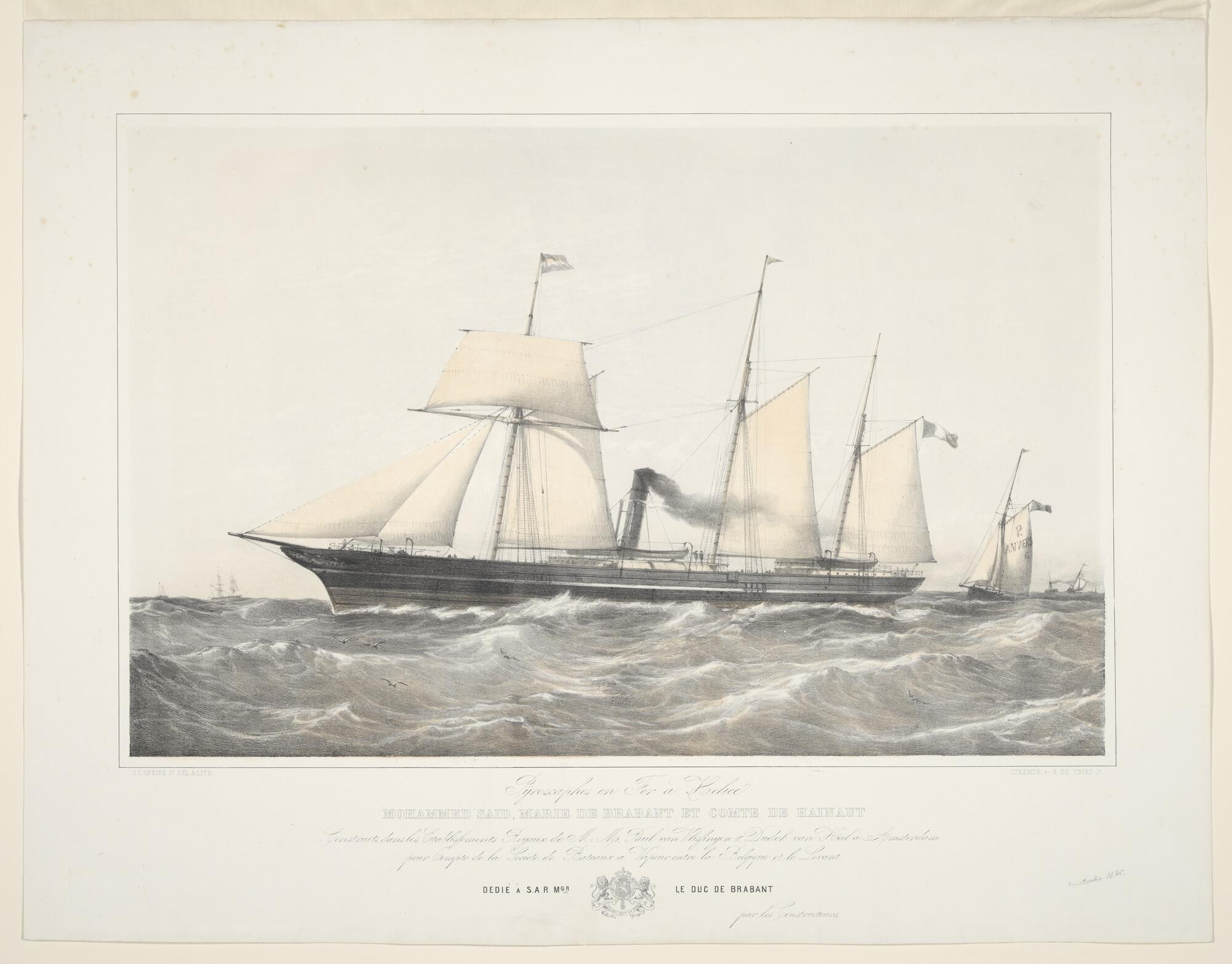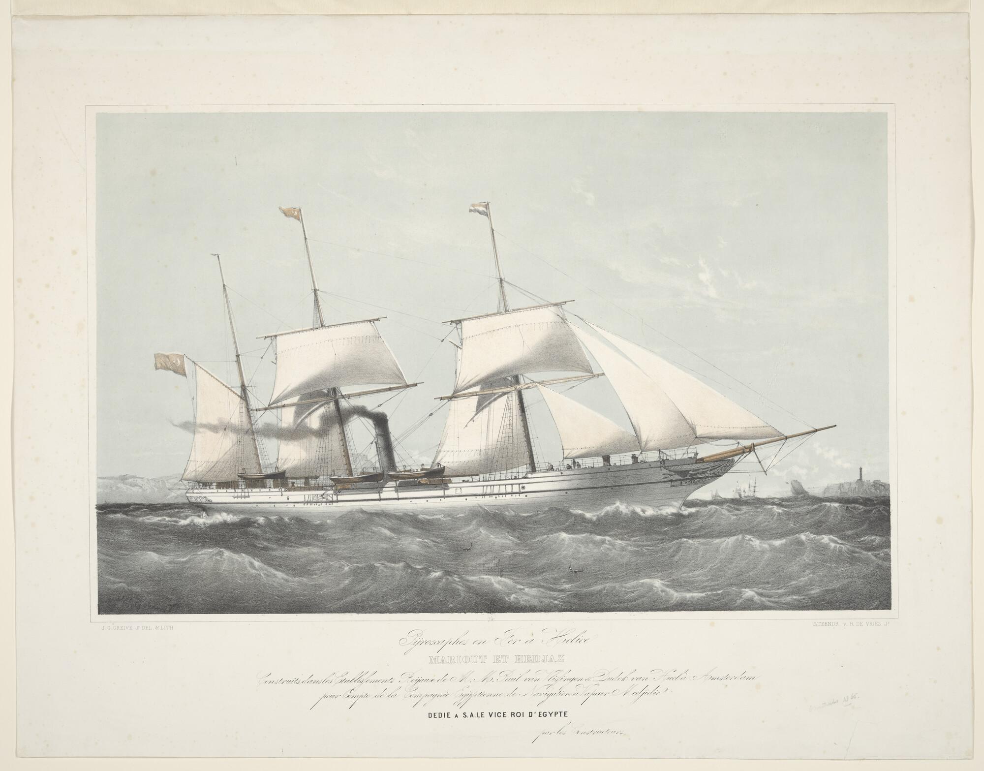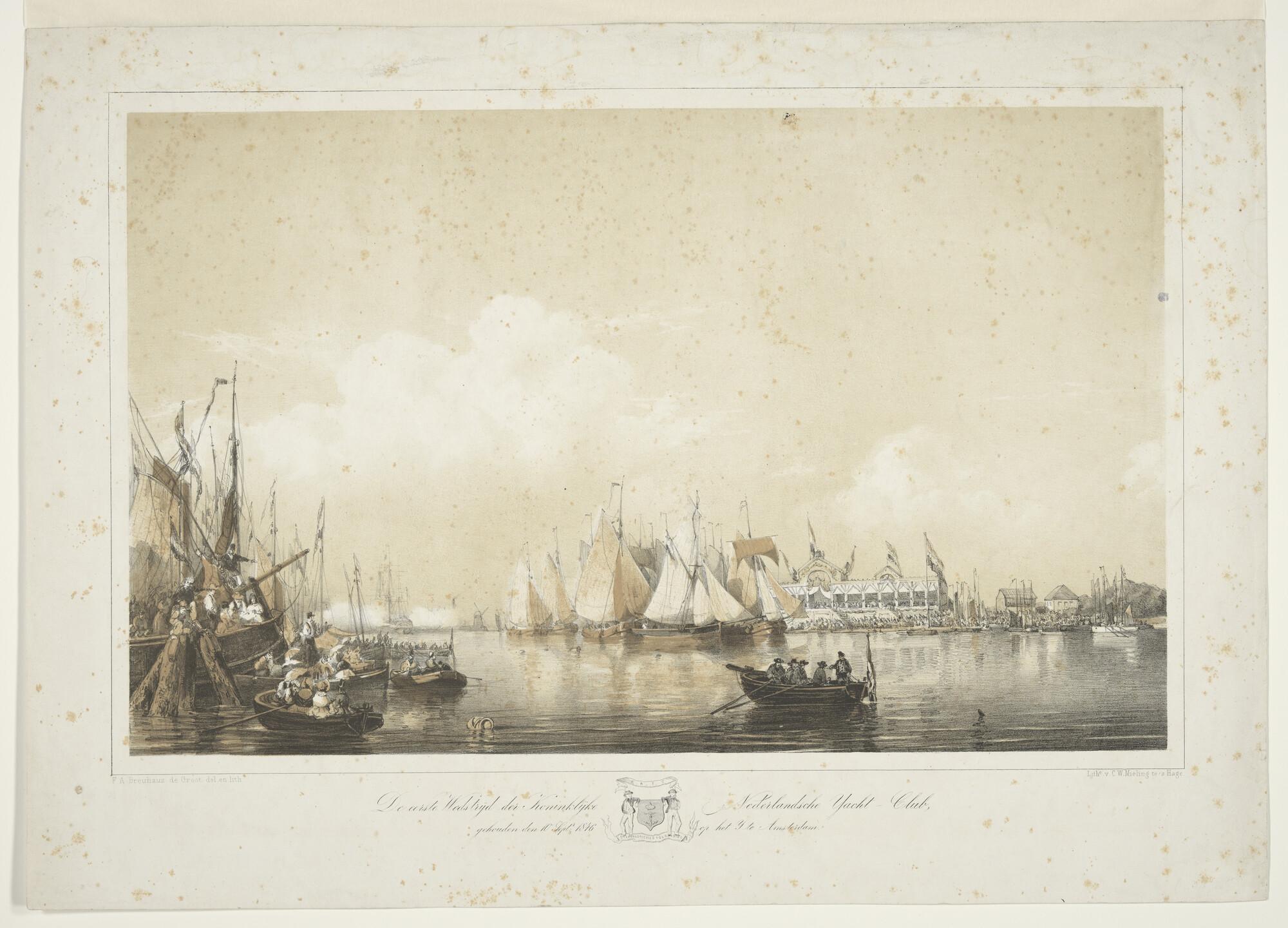 Lithografie van de haven van het Nieuwe Diep, met dr...