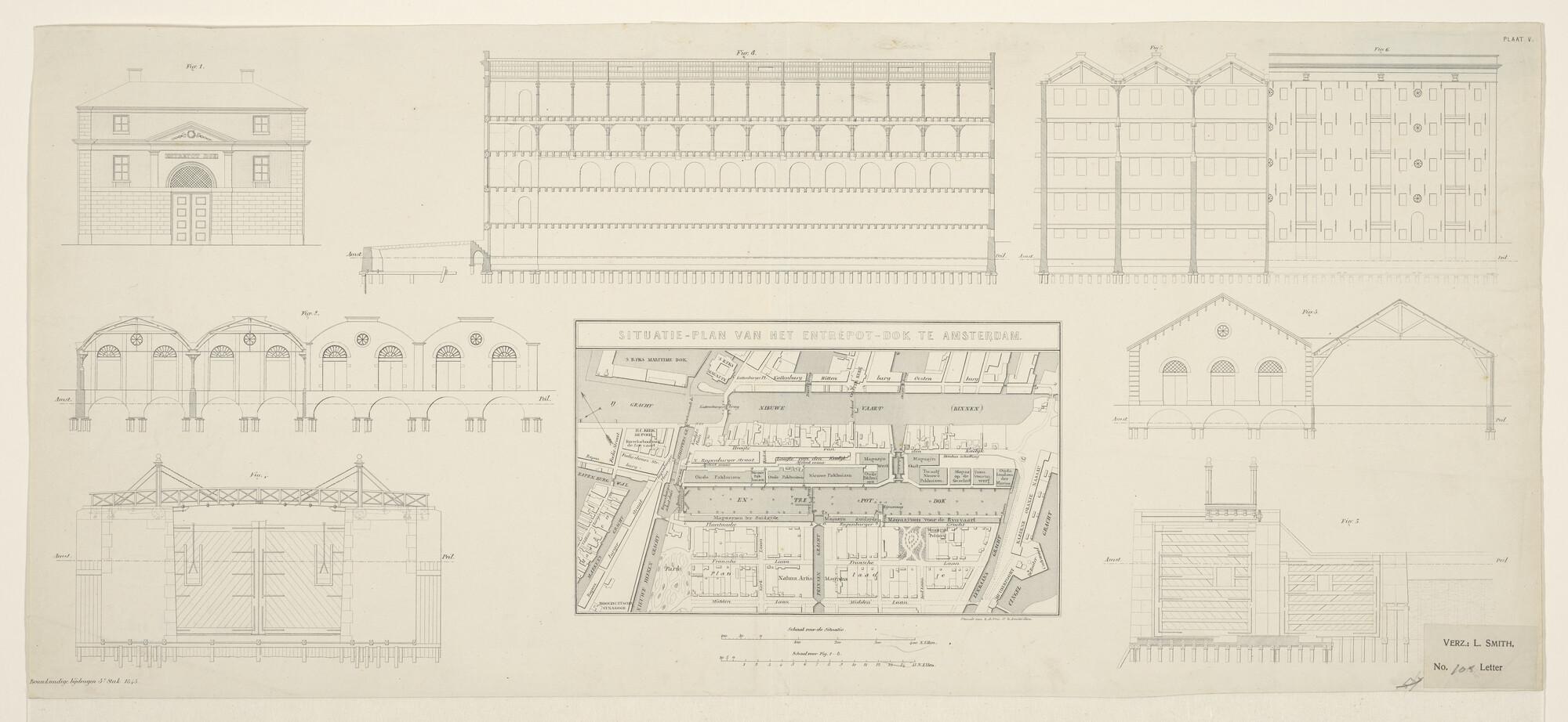 Plattegrond, aanzichten en doorsneden van het Entrep...