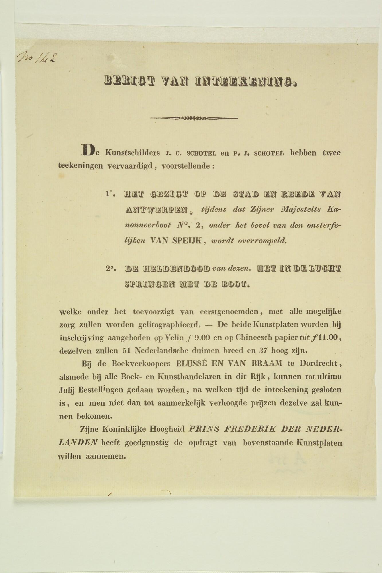 Prospectus van de uitgave van twee prenten door J.C....