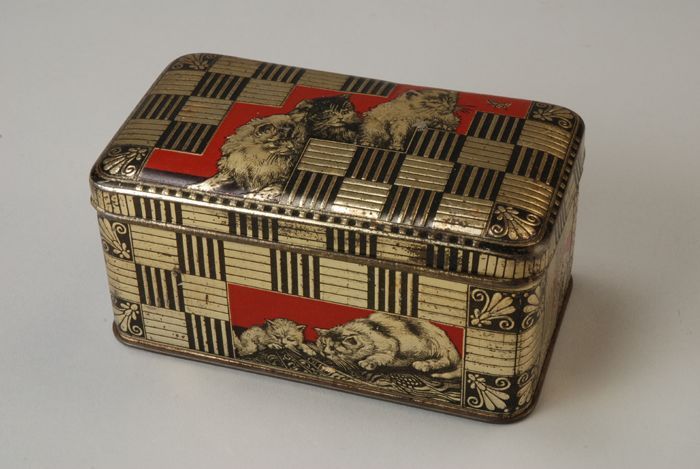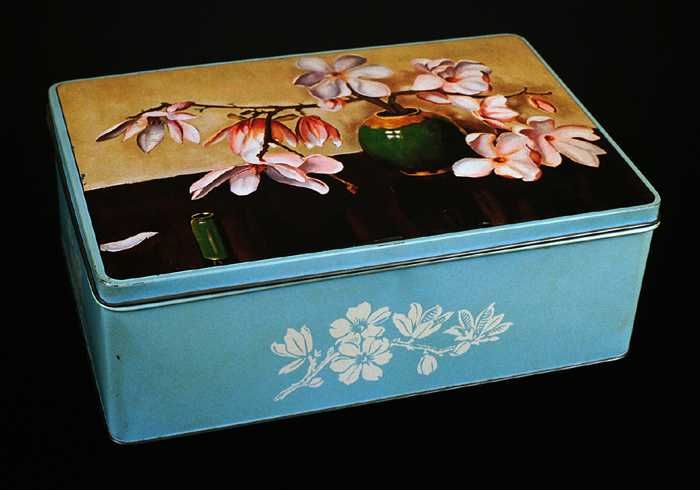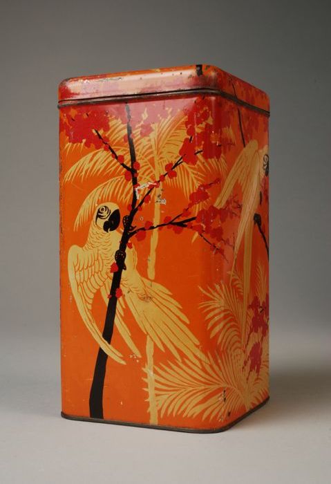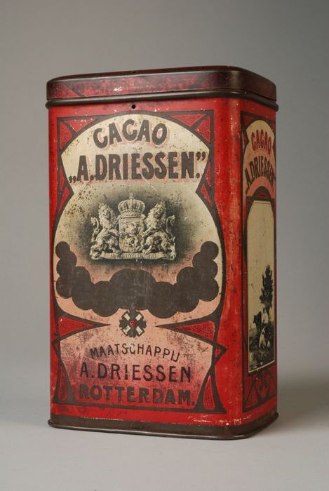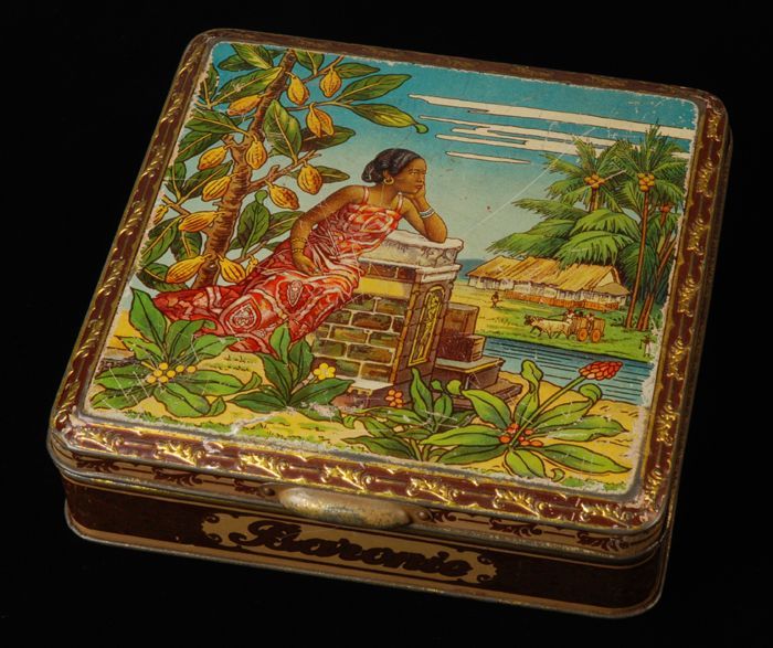 Vierkant cacaoblik met scharnierend deksel, "Korff's...