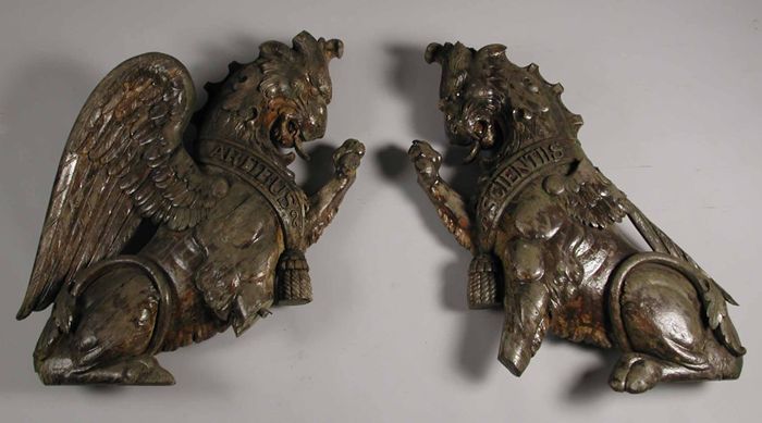 Twee houten griffioenen uit gevel Academie voor Beel...