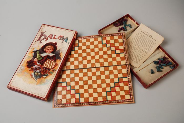 Halma spel, in doos waarop kind met speelbord en pio...
