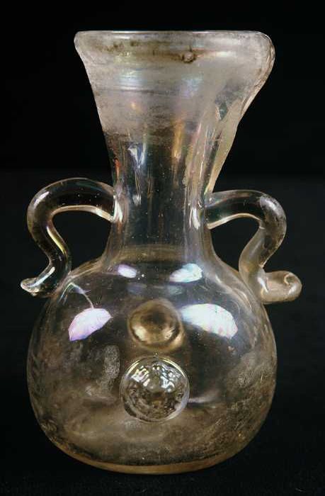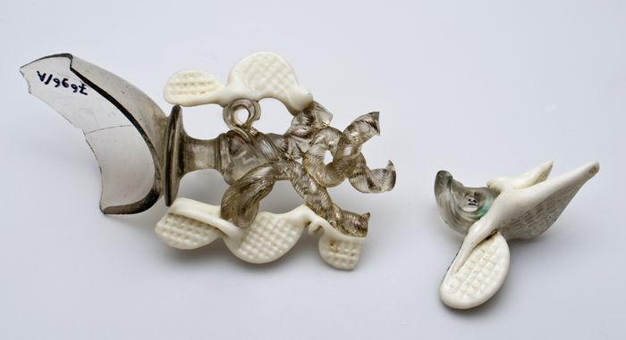 Twee fragmenten van glazen oren of schenktuiten, hel...
