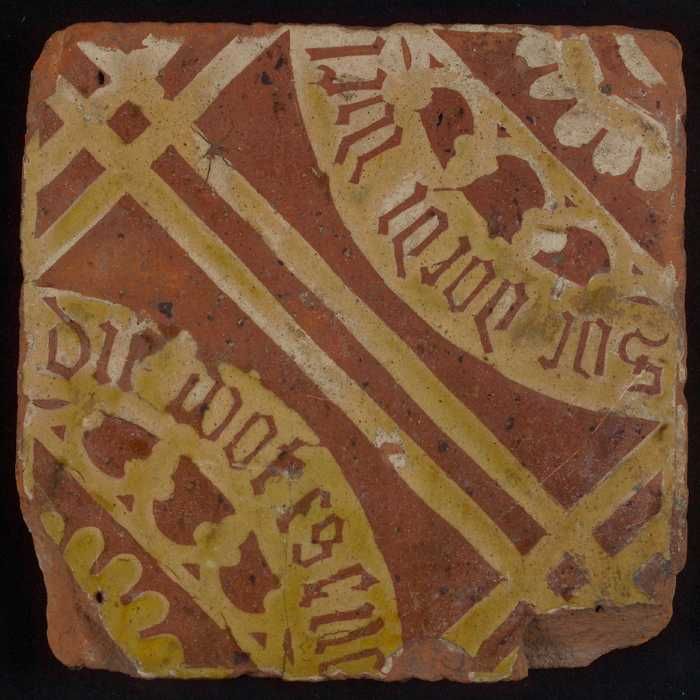 Schrifttegel, vloertegel met gotisch omschrift "So d...