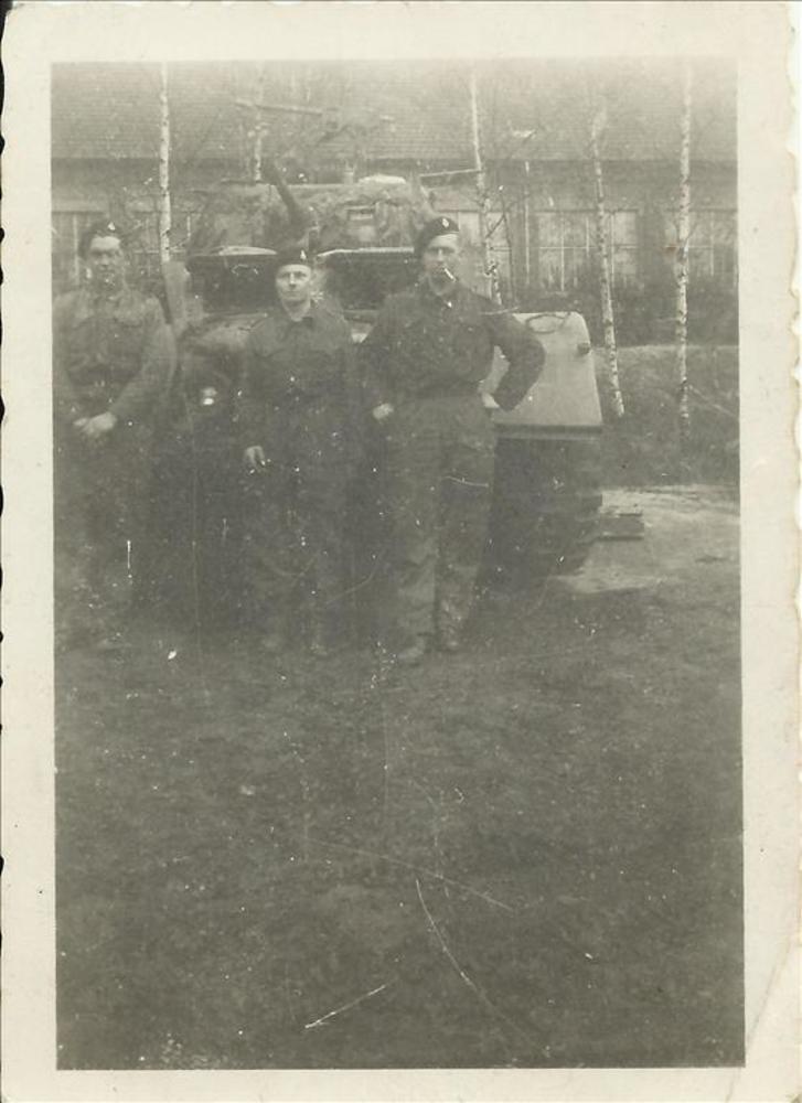Drie Britse soldaten voor tank, locatie onbekend