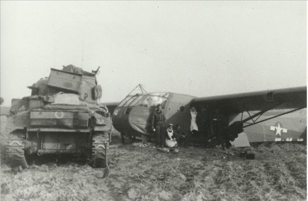Sherman tank naast Waco zweefvliegtuig met personen
