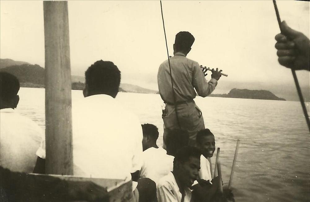 Nieuw-Guinea; Papua's, een met dwarsfluit op voorple...
