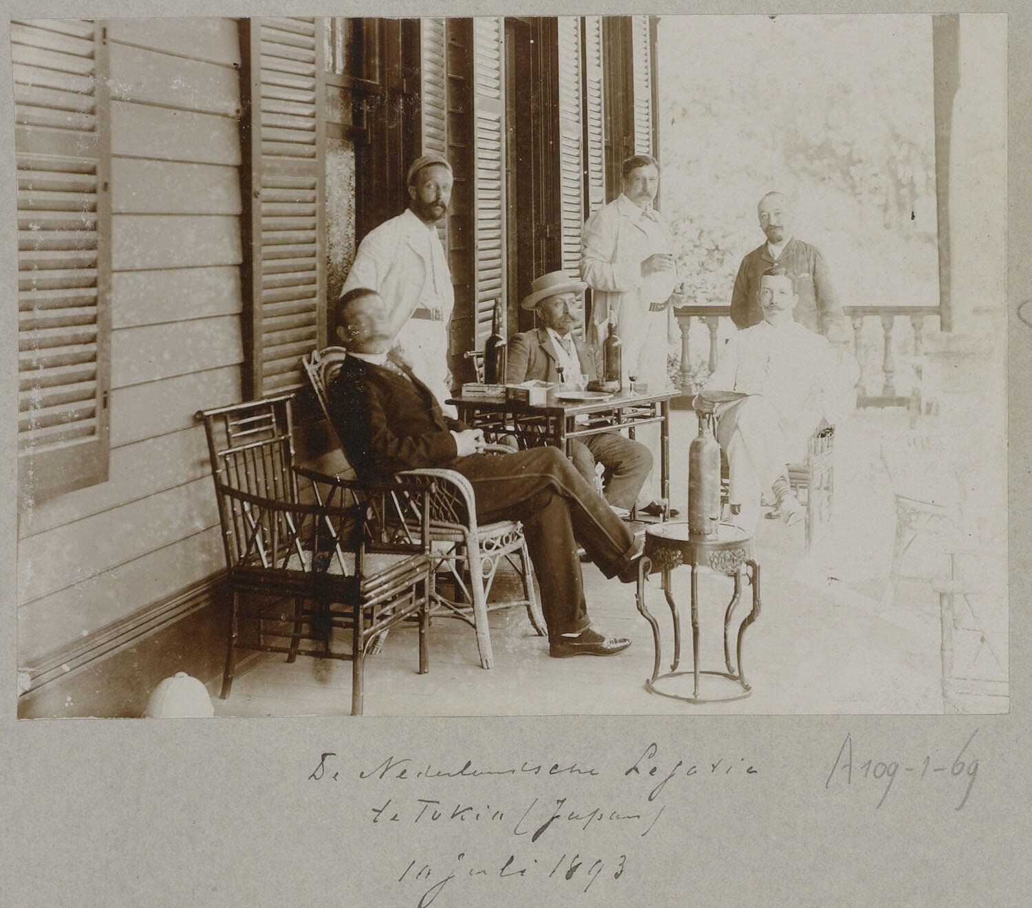 Groepsfoto van diplomaten op het terras van de Neder...