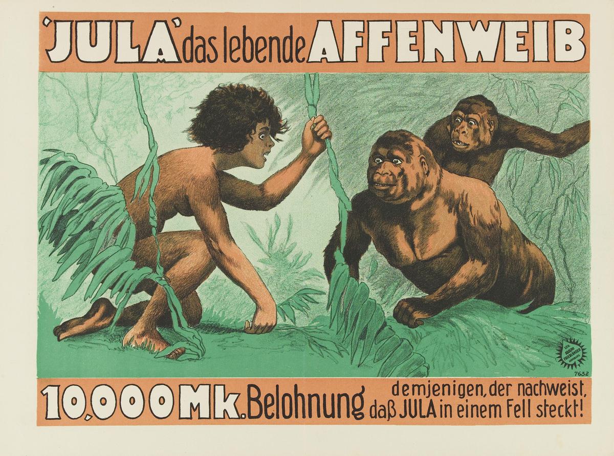 Afbeelding en tekst "Jula, das lebende Affenweib"