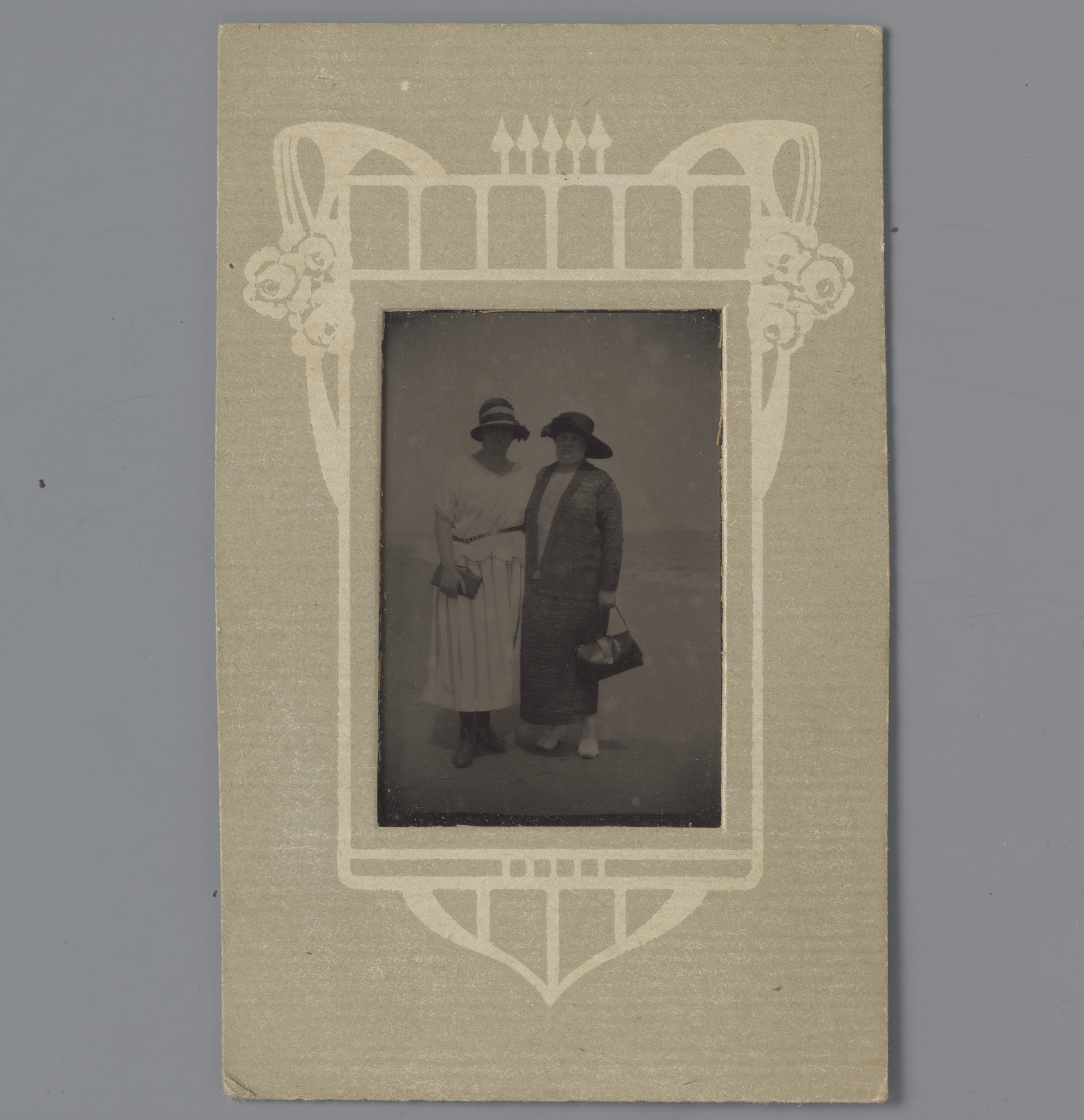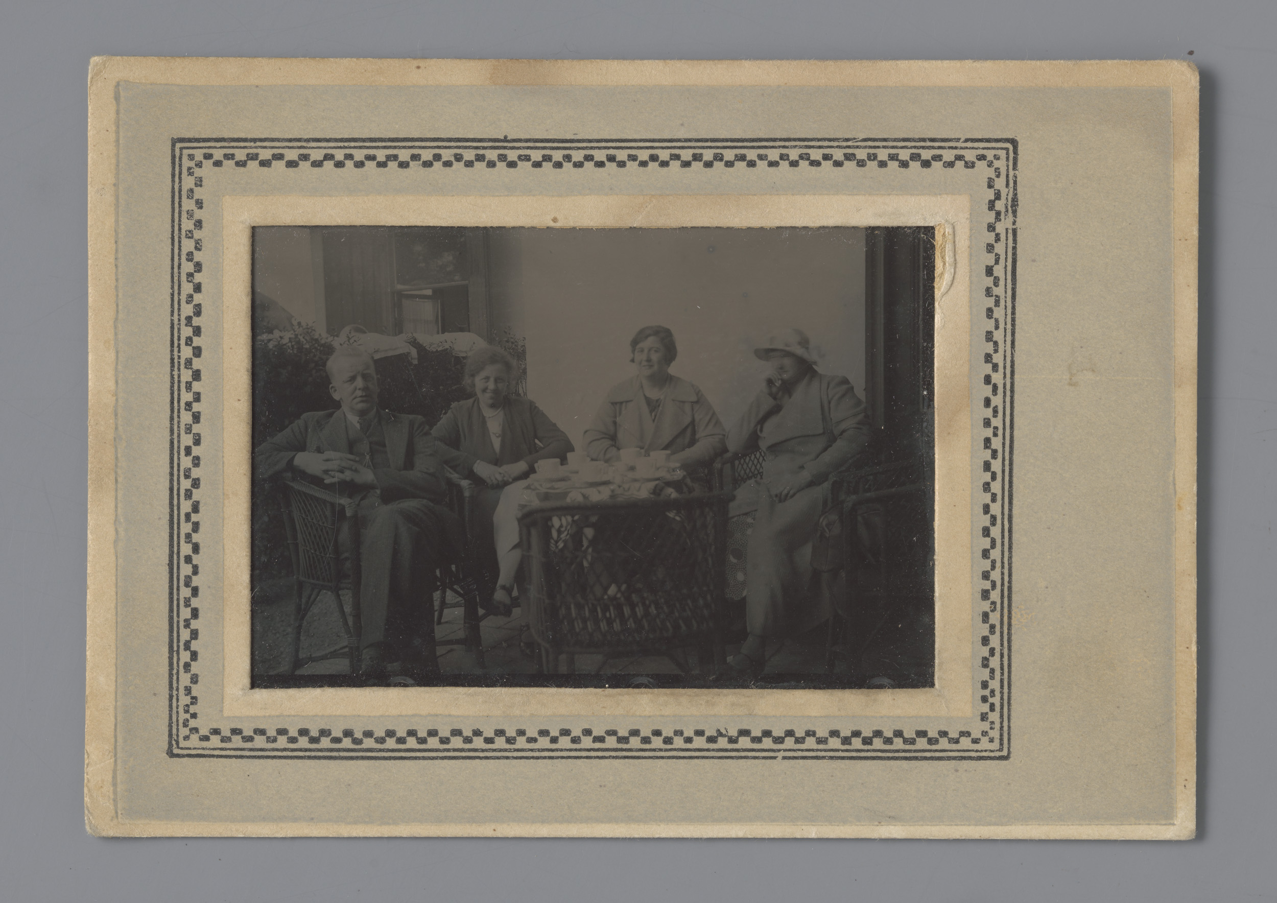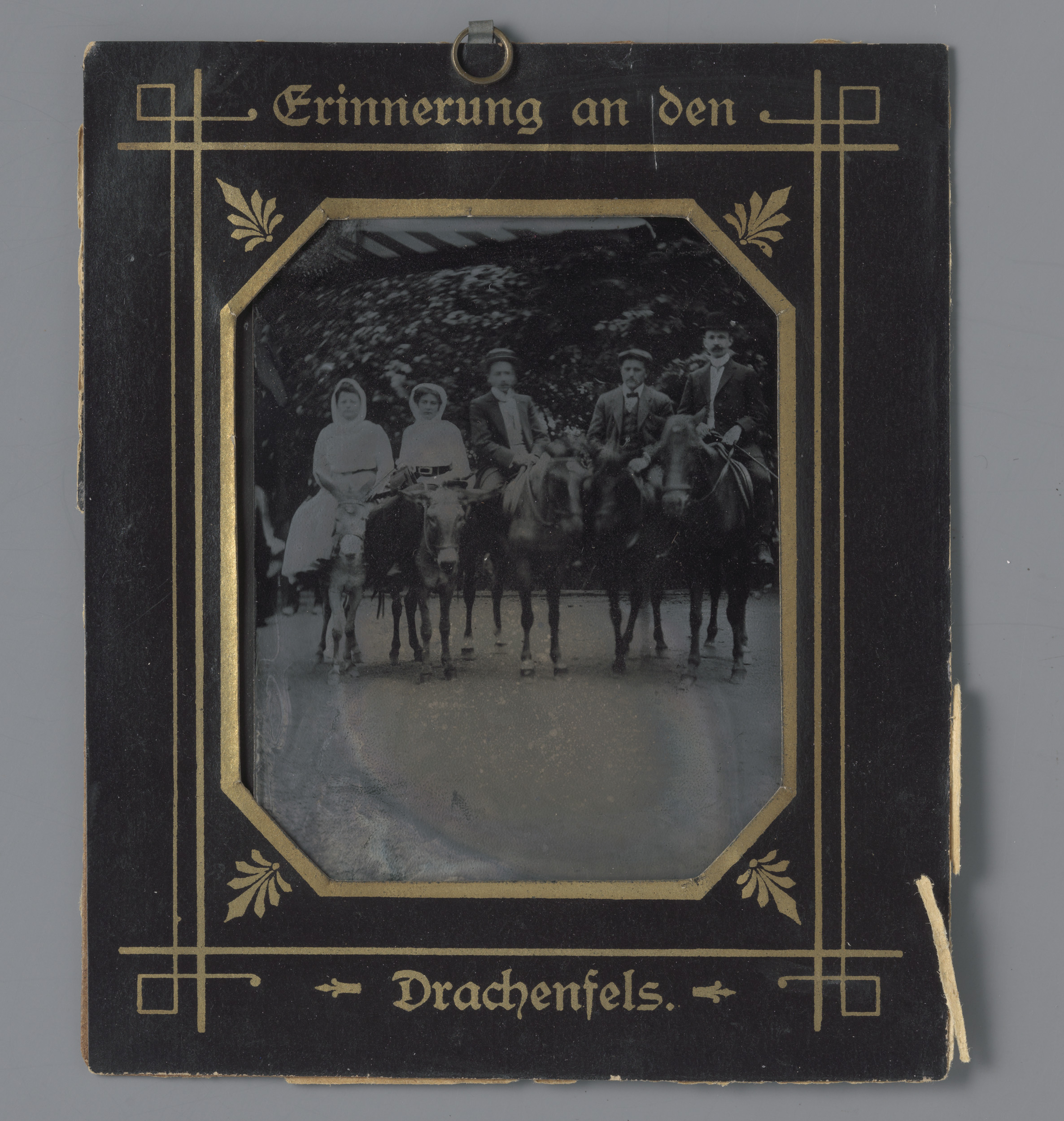 Groepsportret van twee vrouwen op ezels en drie mann...