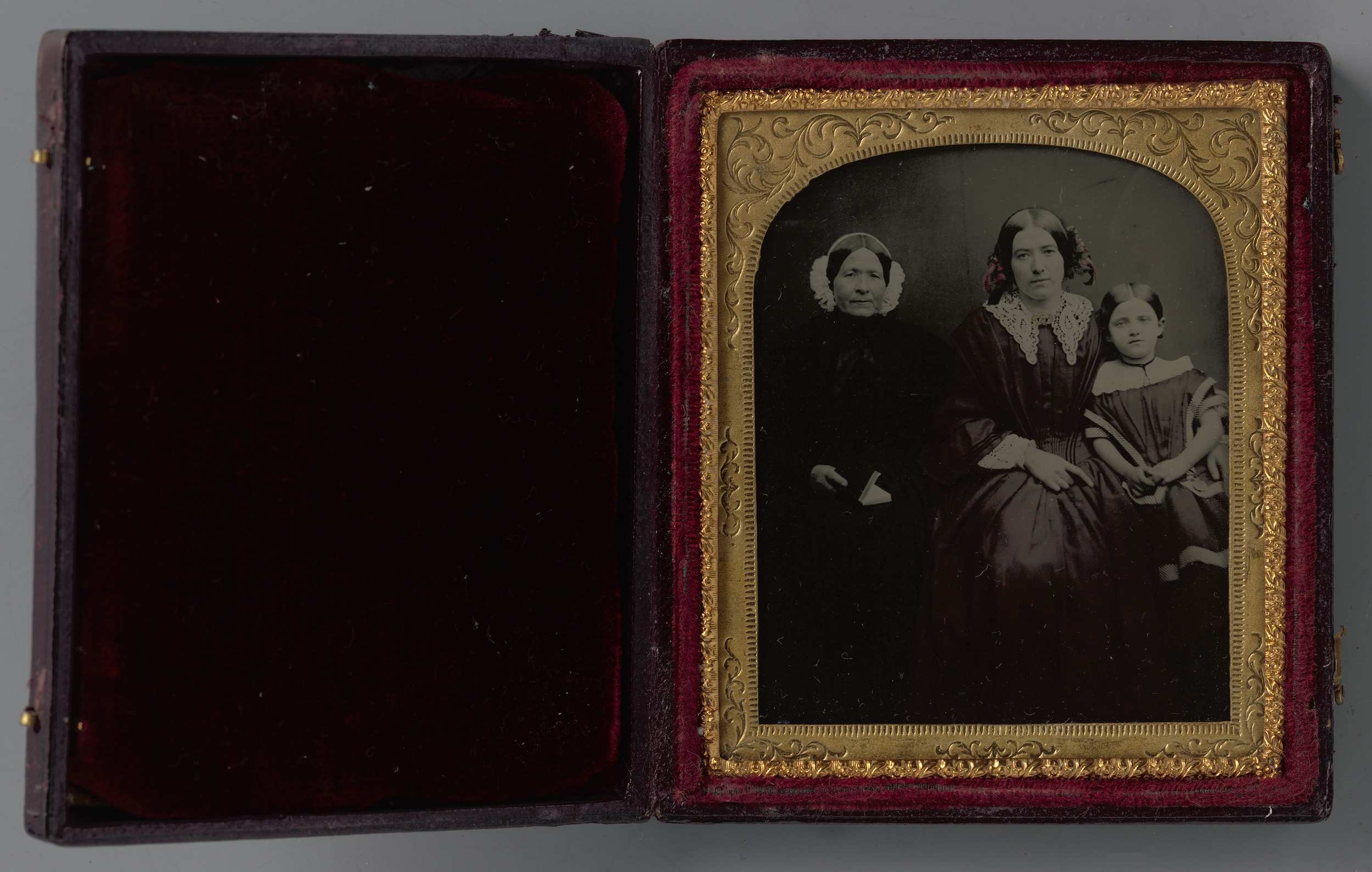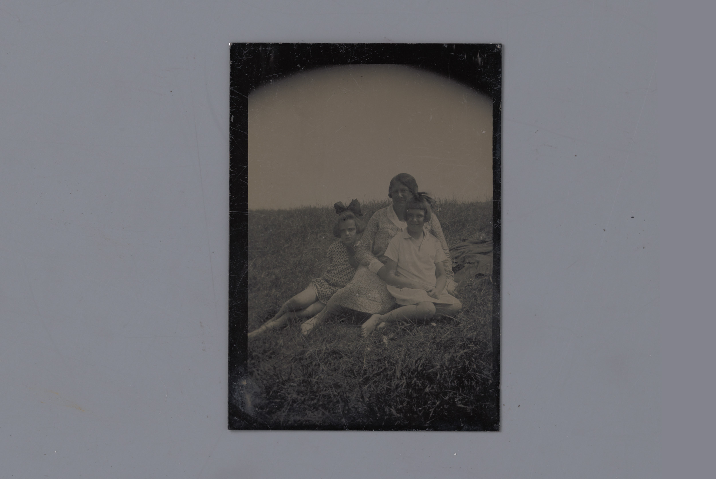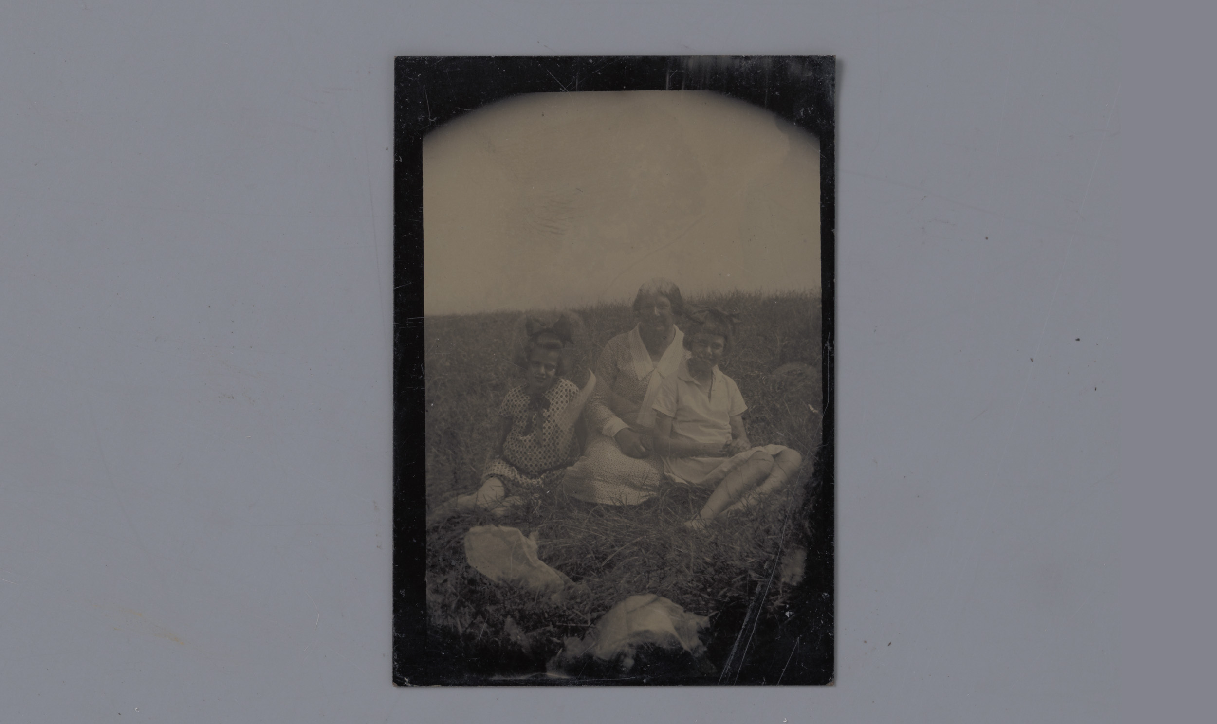 Groepsportret van twee vrouwen op ezels en drie mann...