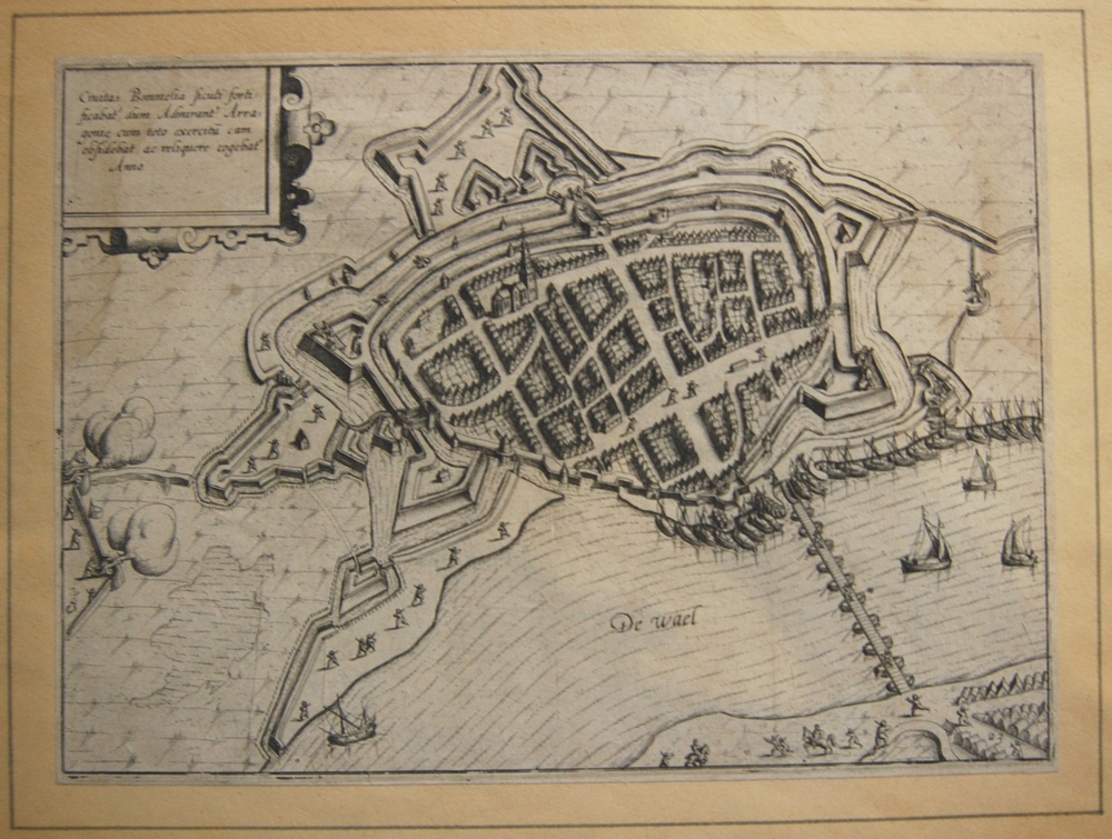 Vogelvlucht beleg Zaltbommel in 1599 met forten, sch...