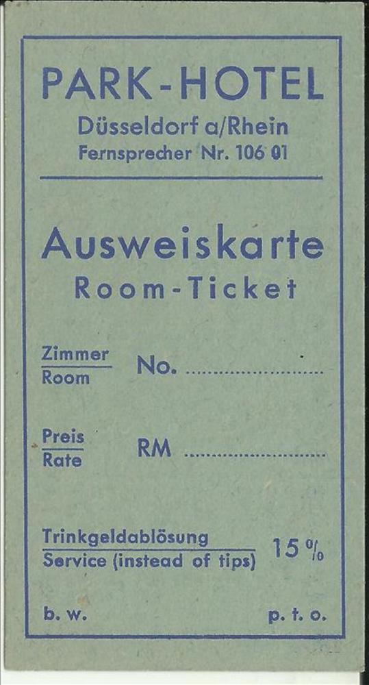 Ausweiskarte Room Ticket Park Hotel Düsseldorf a/ Rhein