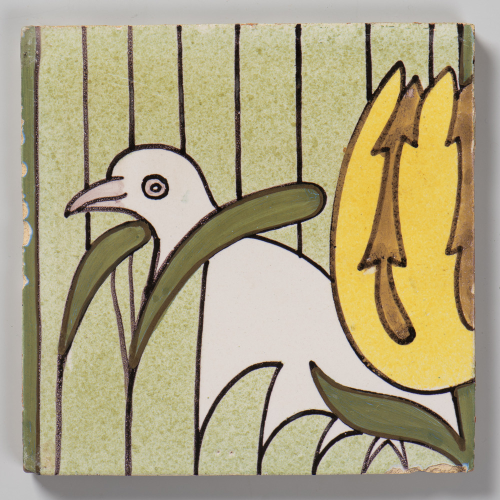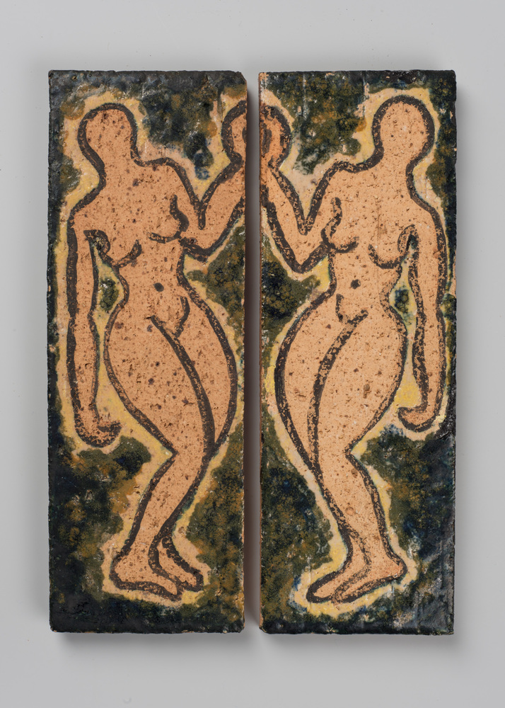 Tegel van aardewerk, deels met glazuur, voorstellend...
