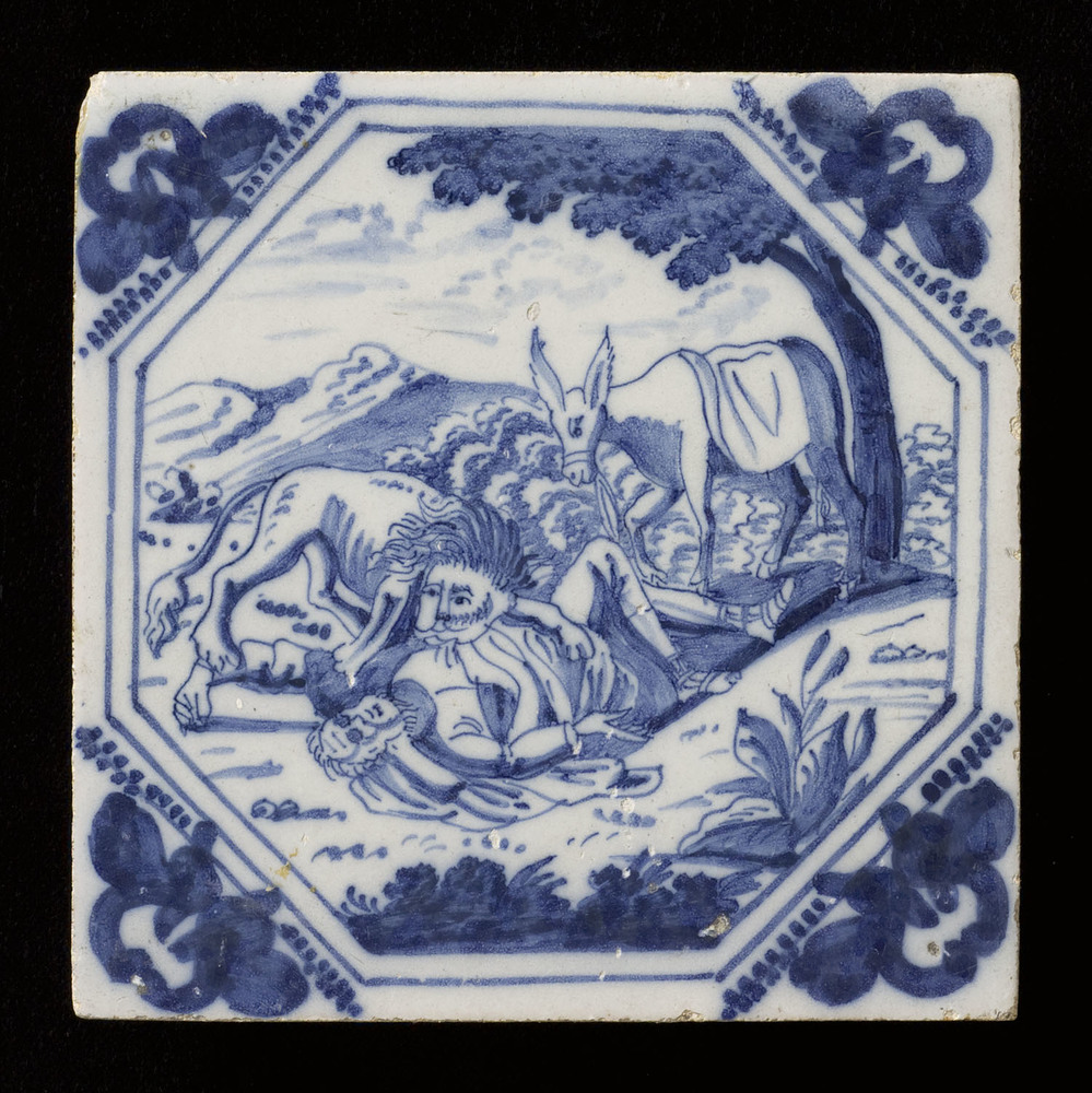 Tegel van keramiek met tinglazuur, voorstellende: De...