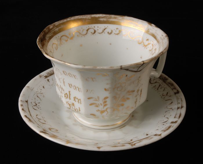 Witte kop en schotel met goudkleurige decoratie, ter...