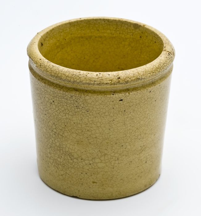 Zalfpot geel geglazuurd, taps van vorm met bindgroef...