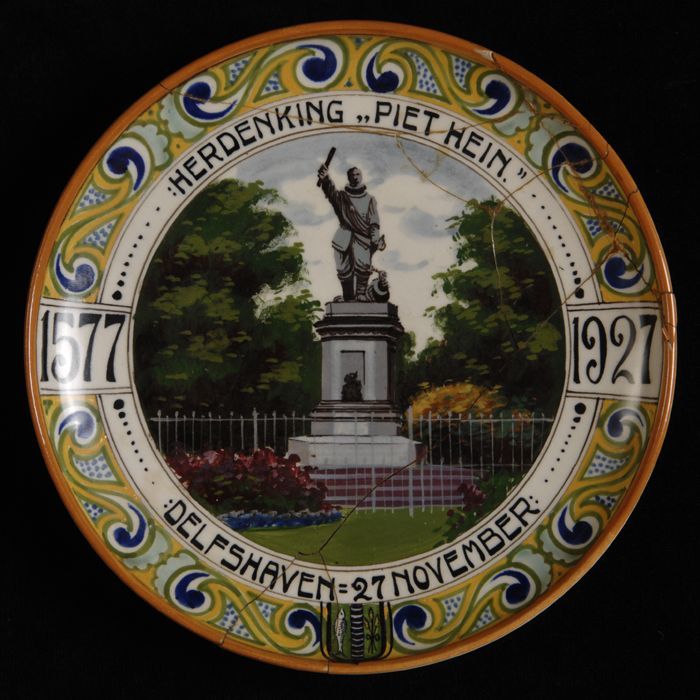 Meerkleurig wandbord met voorstelling standbeeld van...