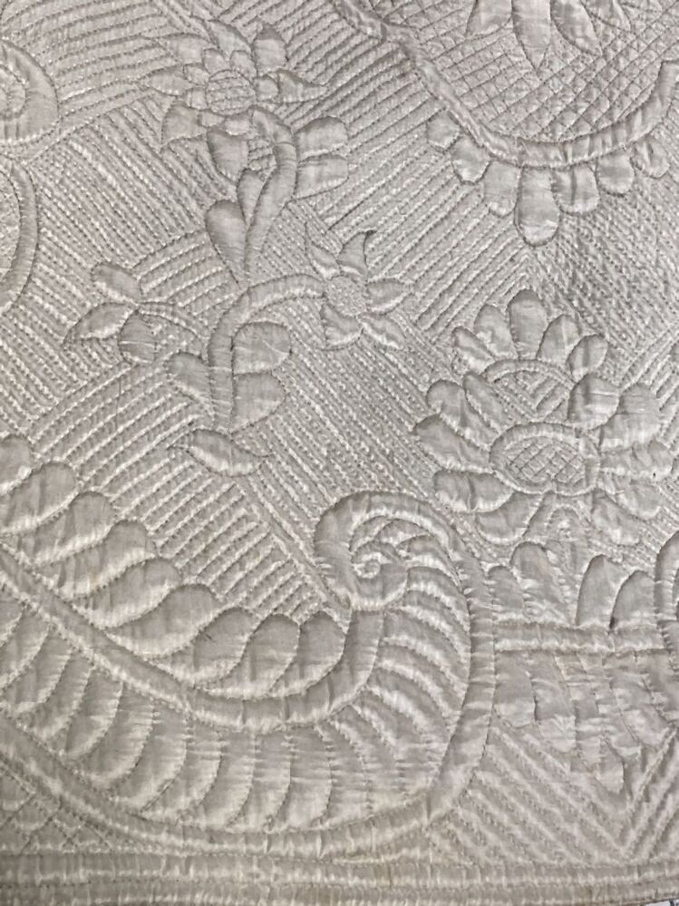 Wijde rok van witte zijde, geheel doorgestikt in flo...