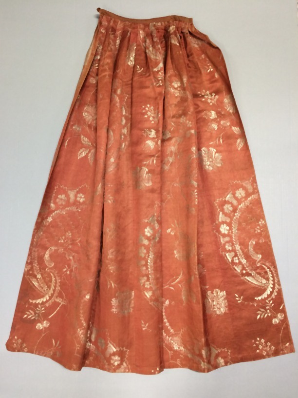 Schort van rood, bruin en grijs zijden damast met ra...