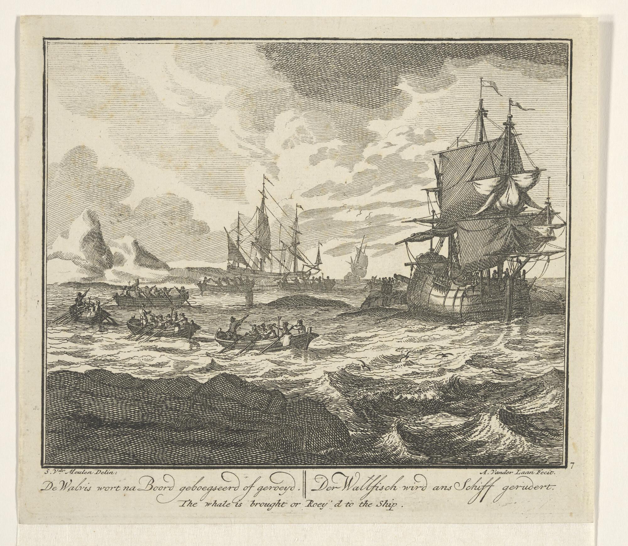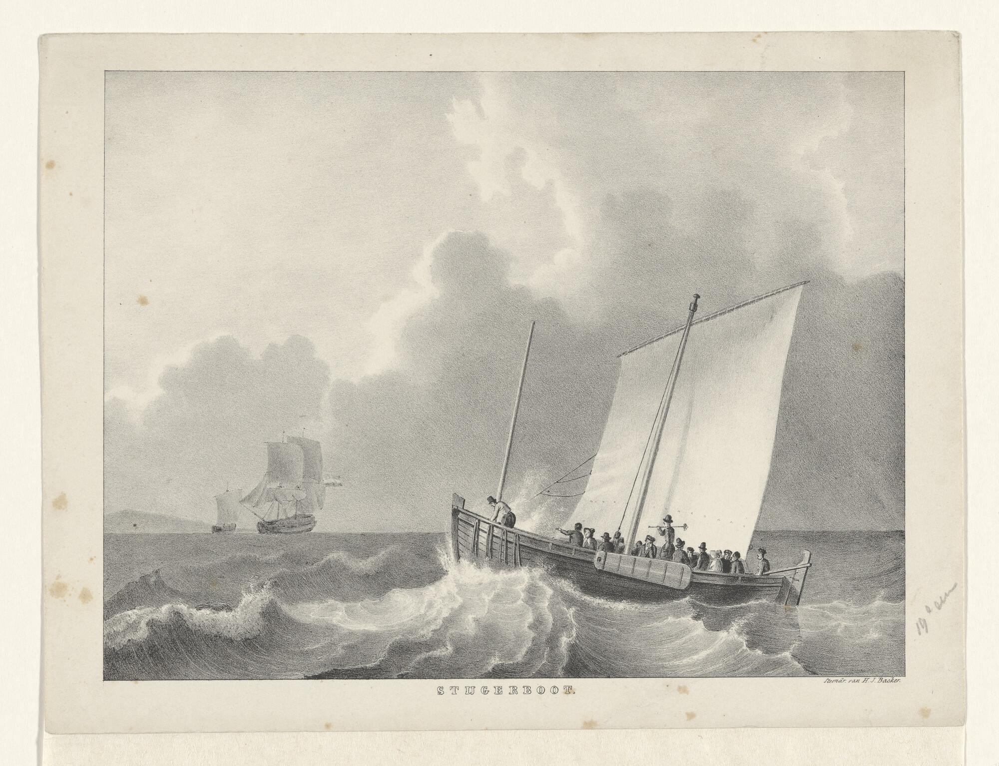 Een hooischip en verso een roeiboot die gewrikt wordt