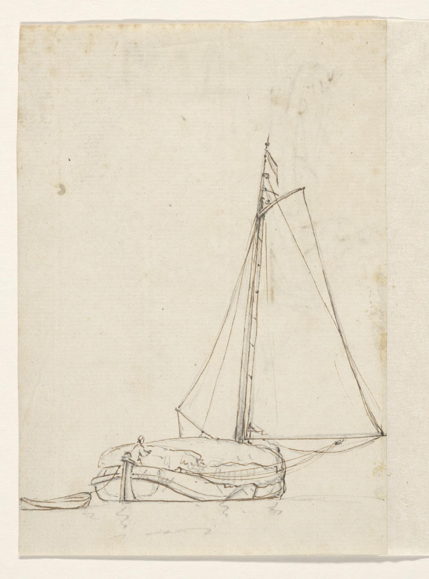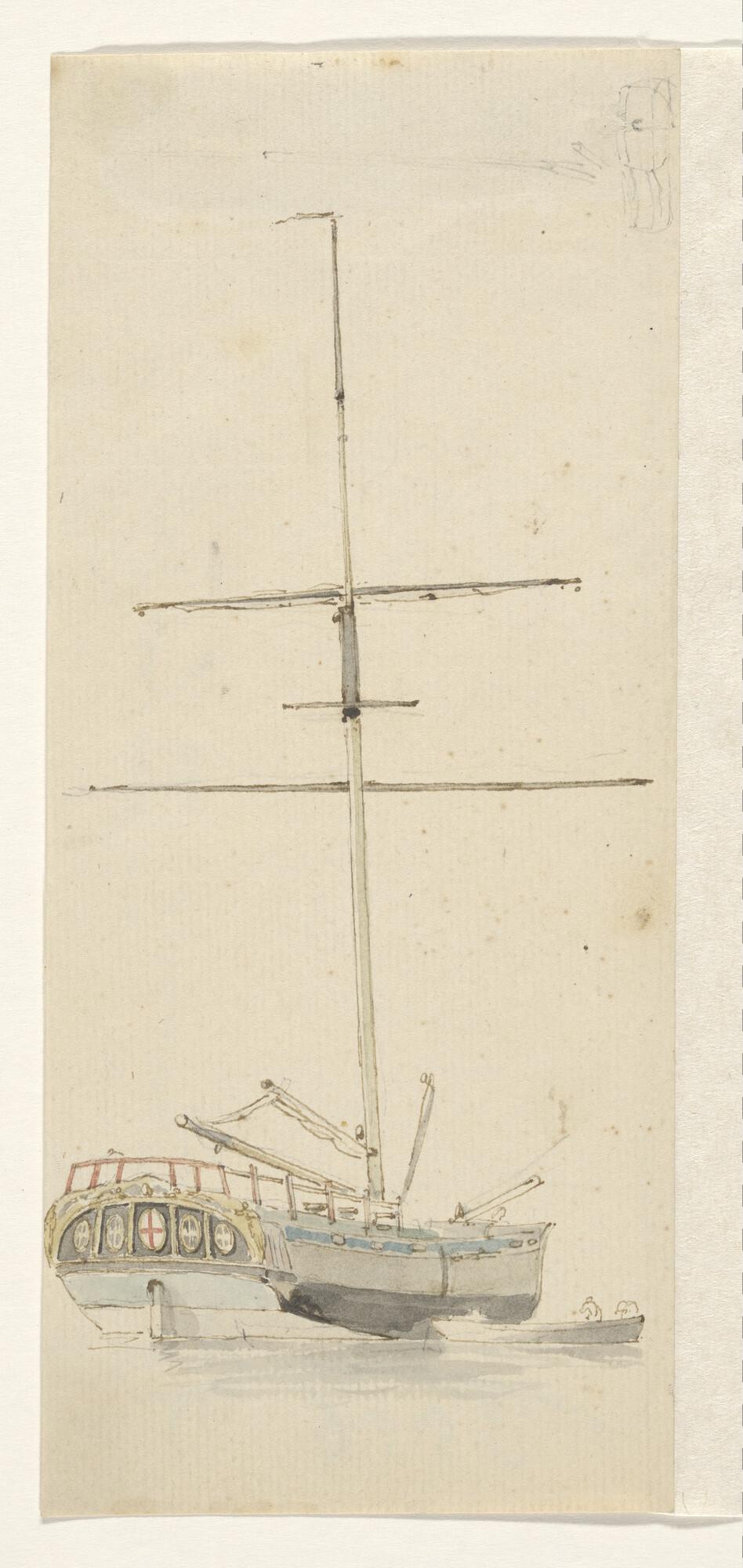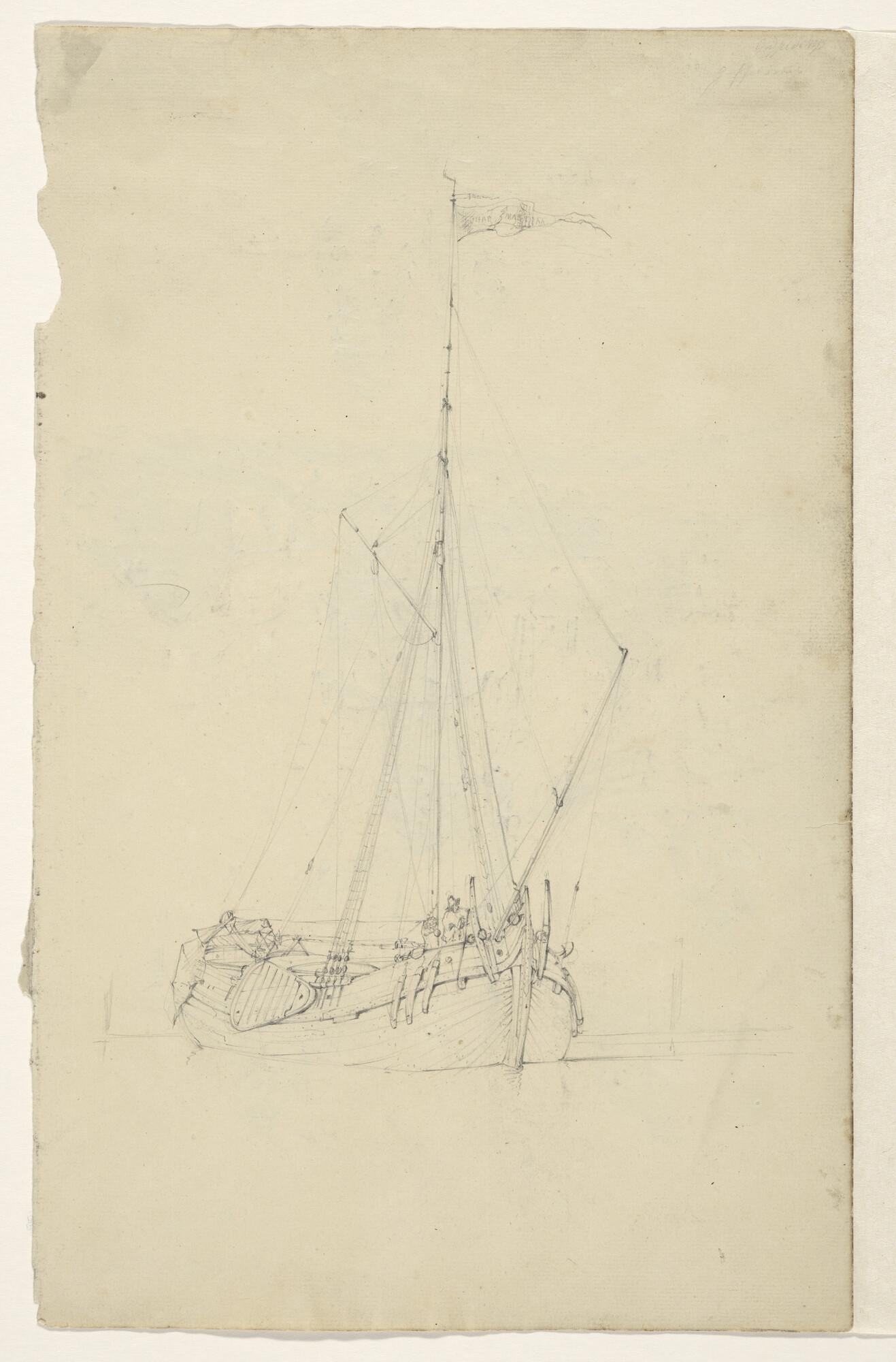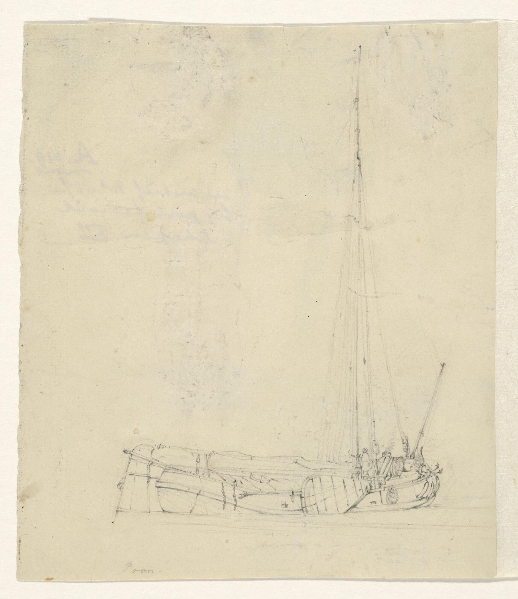 Een jacht en een binnenschip en verso: een krabbel