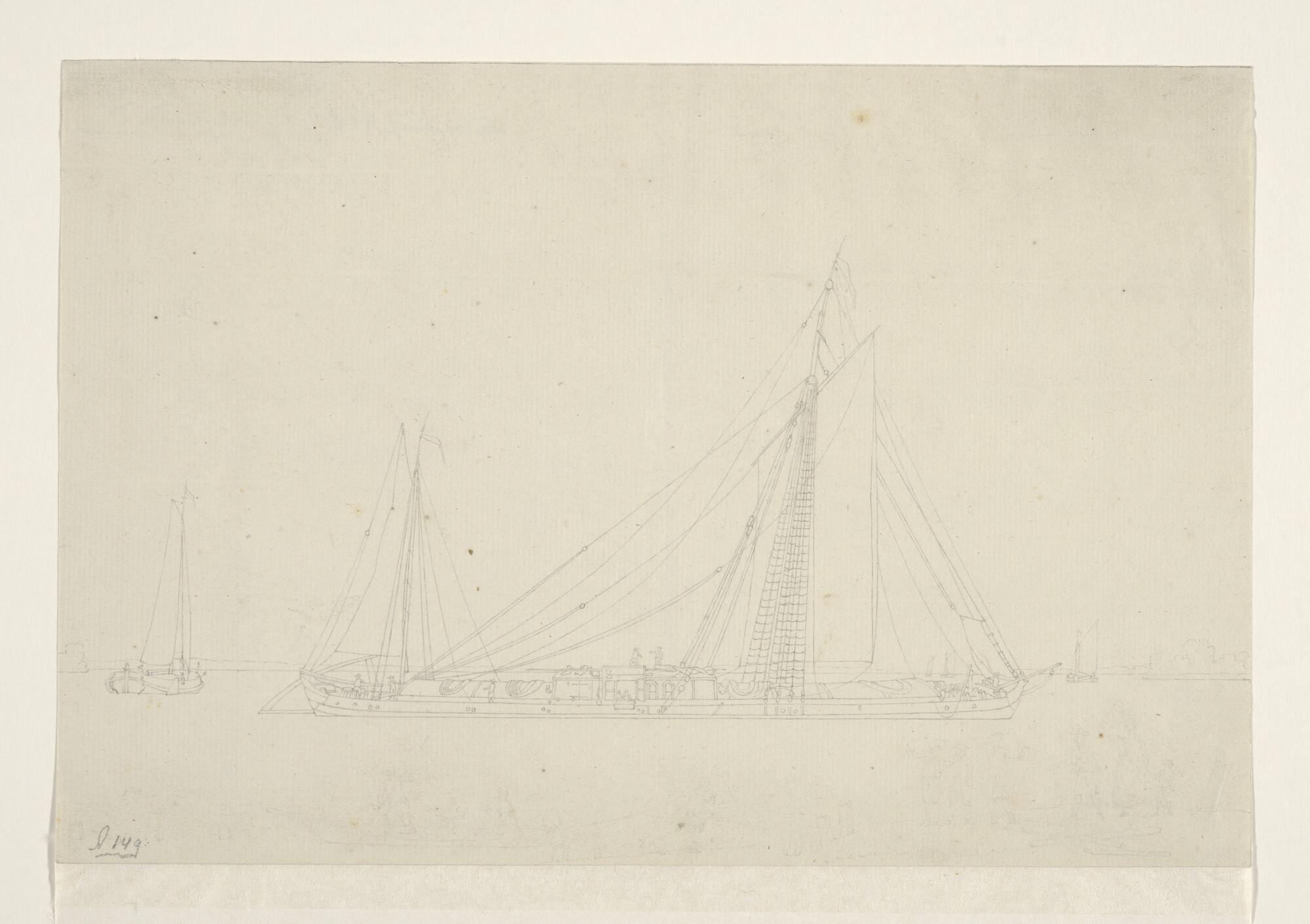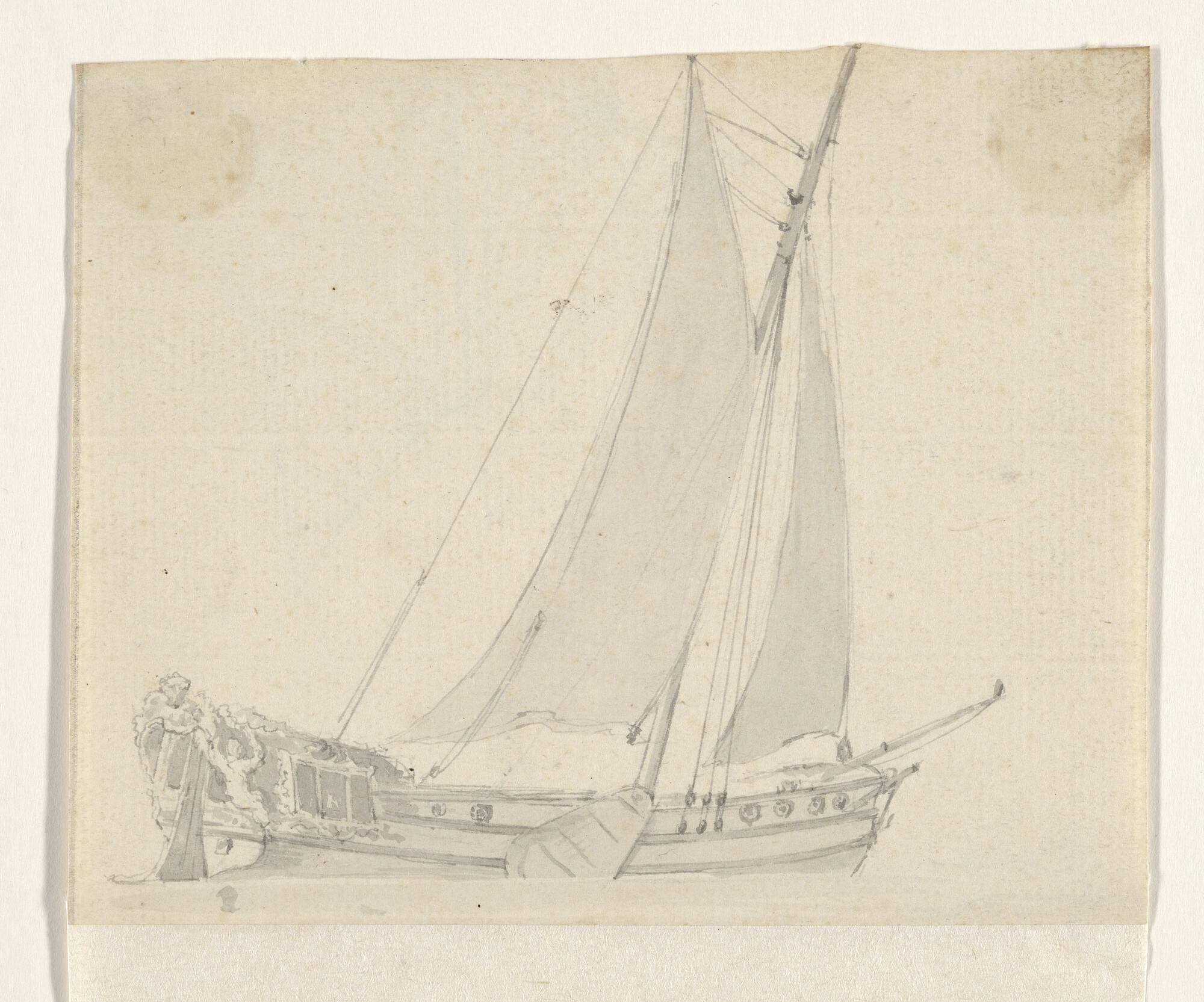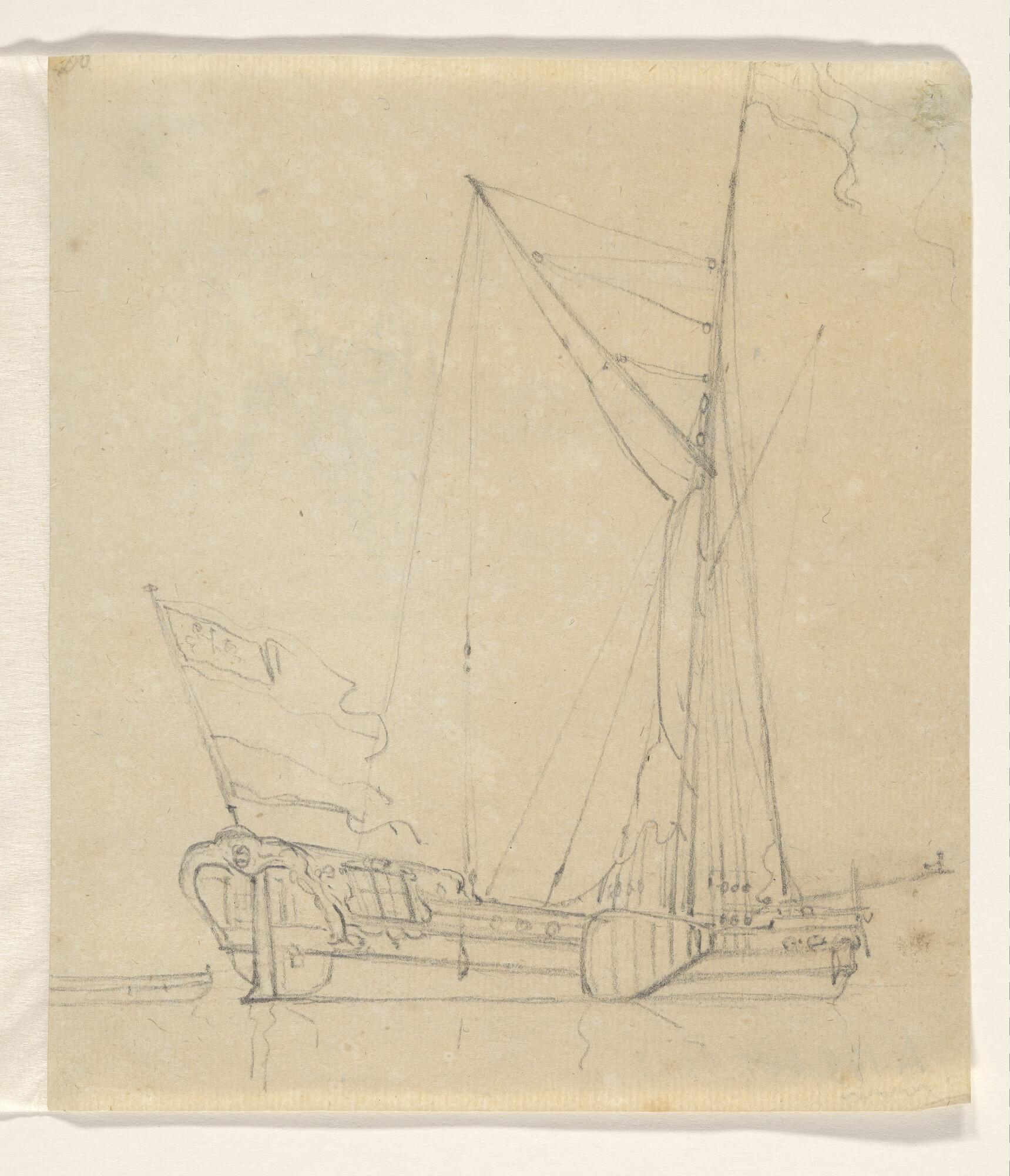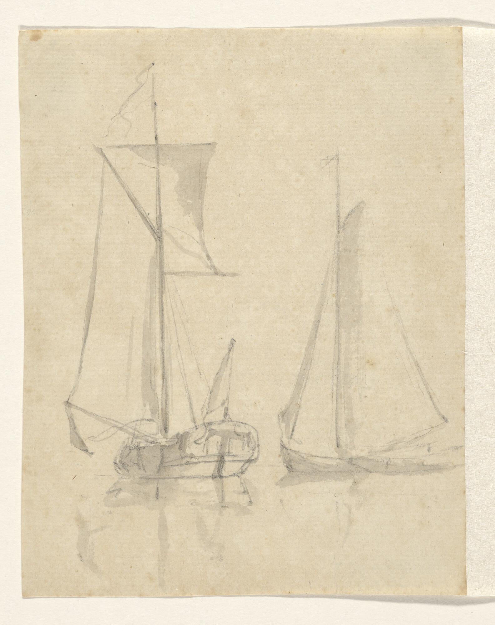 Een jacht en een binnenschip en verso: een krabbel