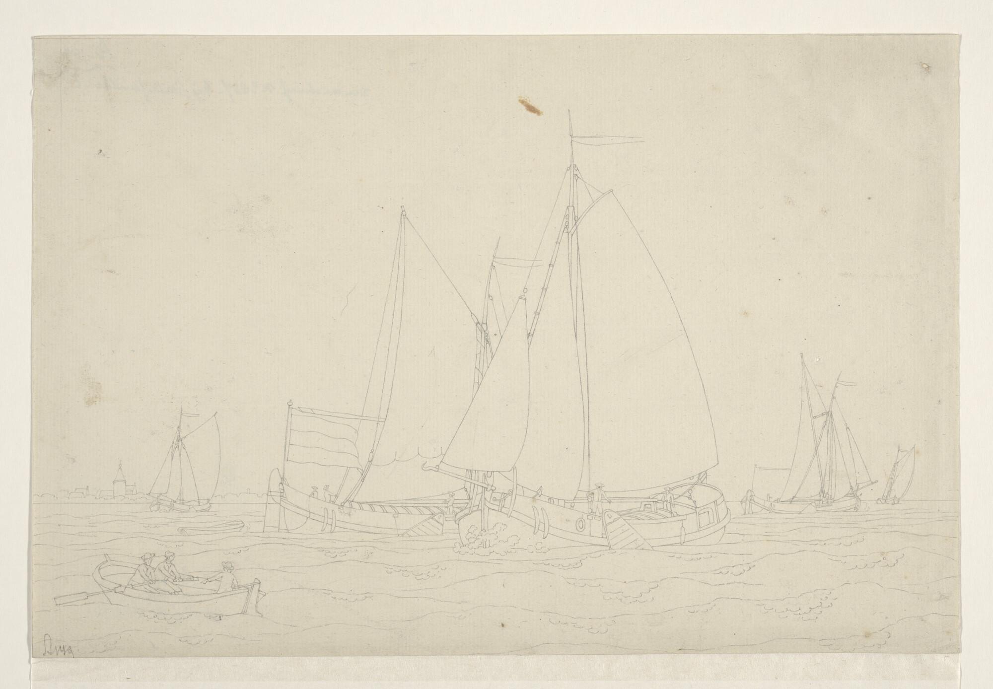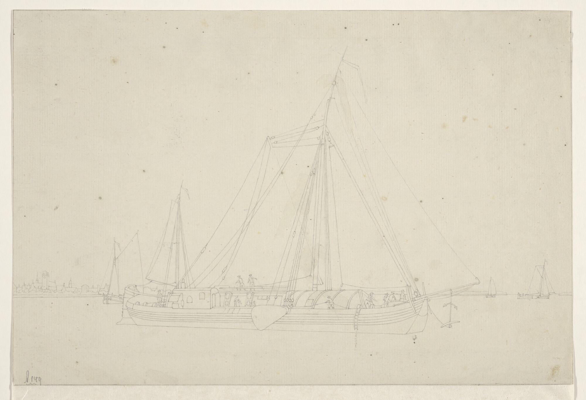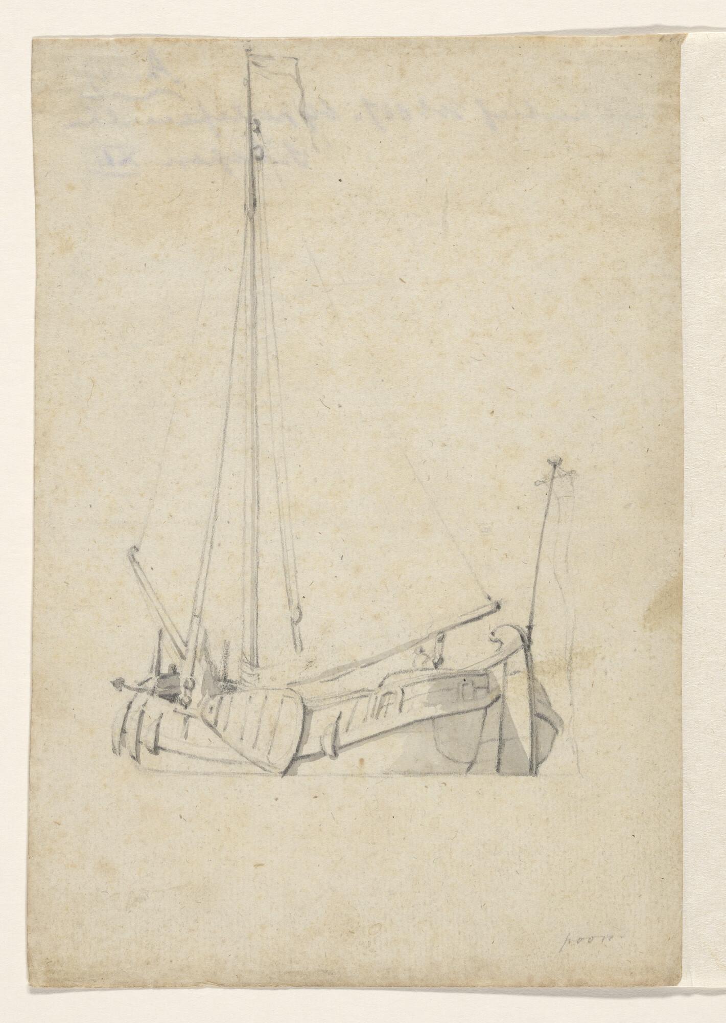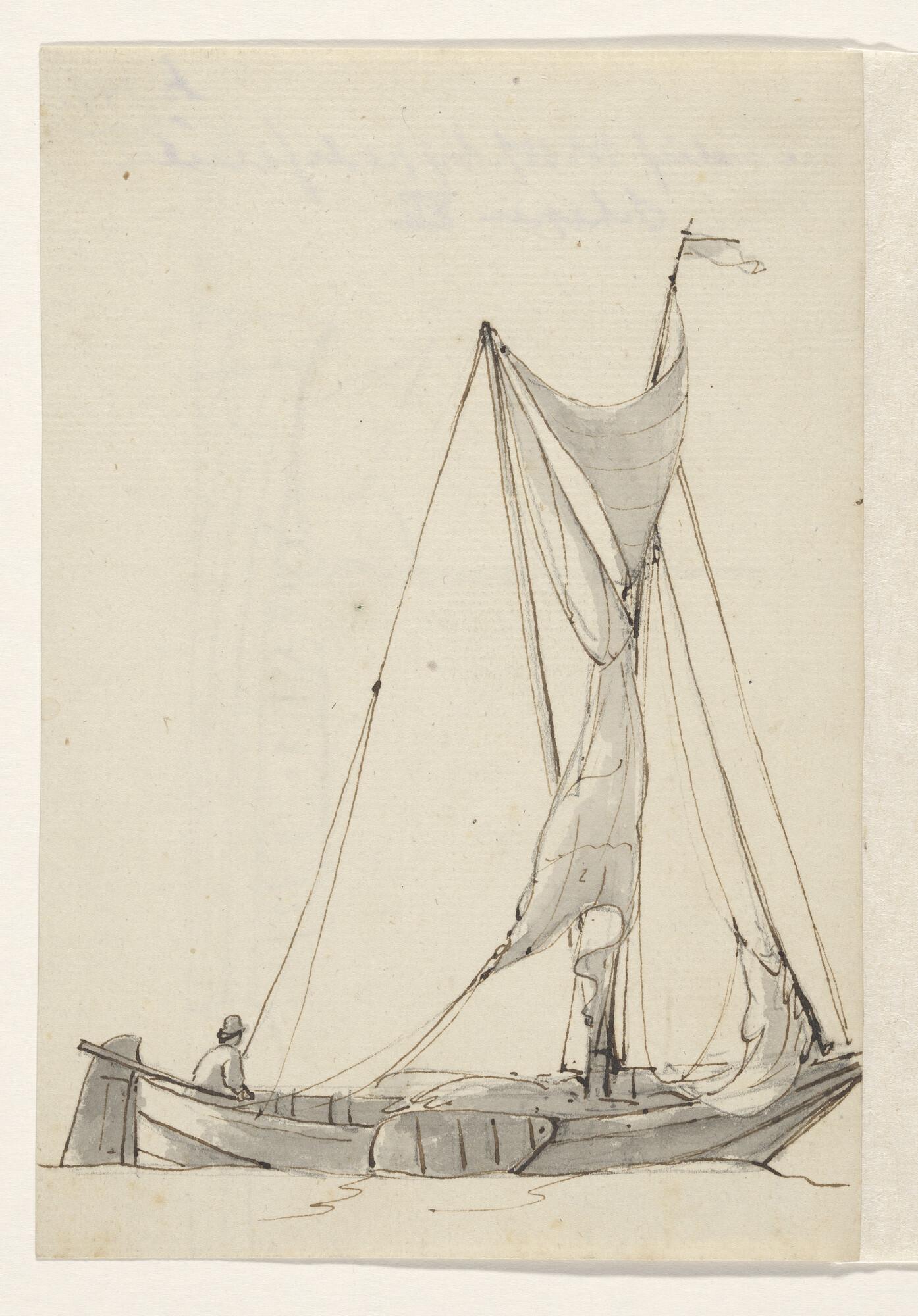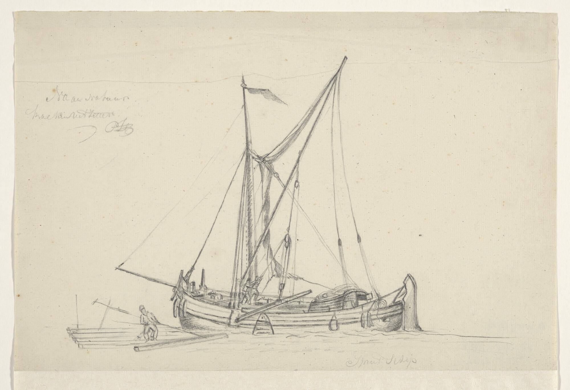 Een jacht en een binnenschip en verso: een krabbel