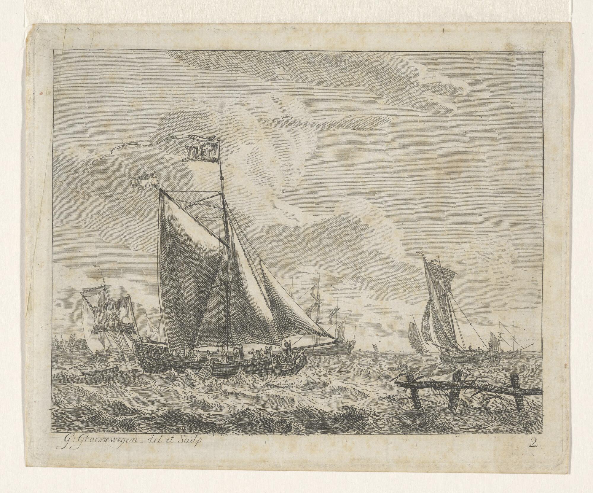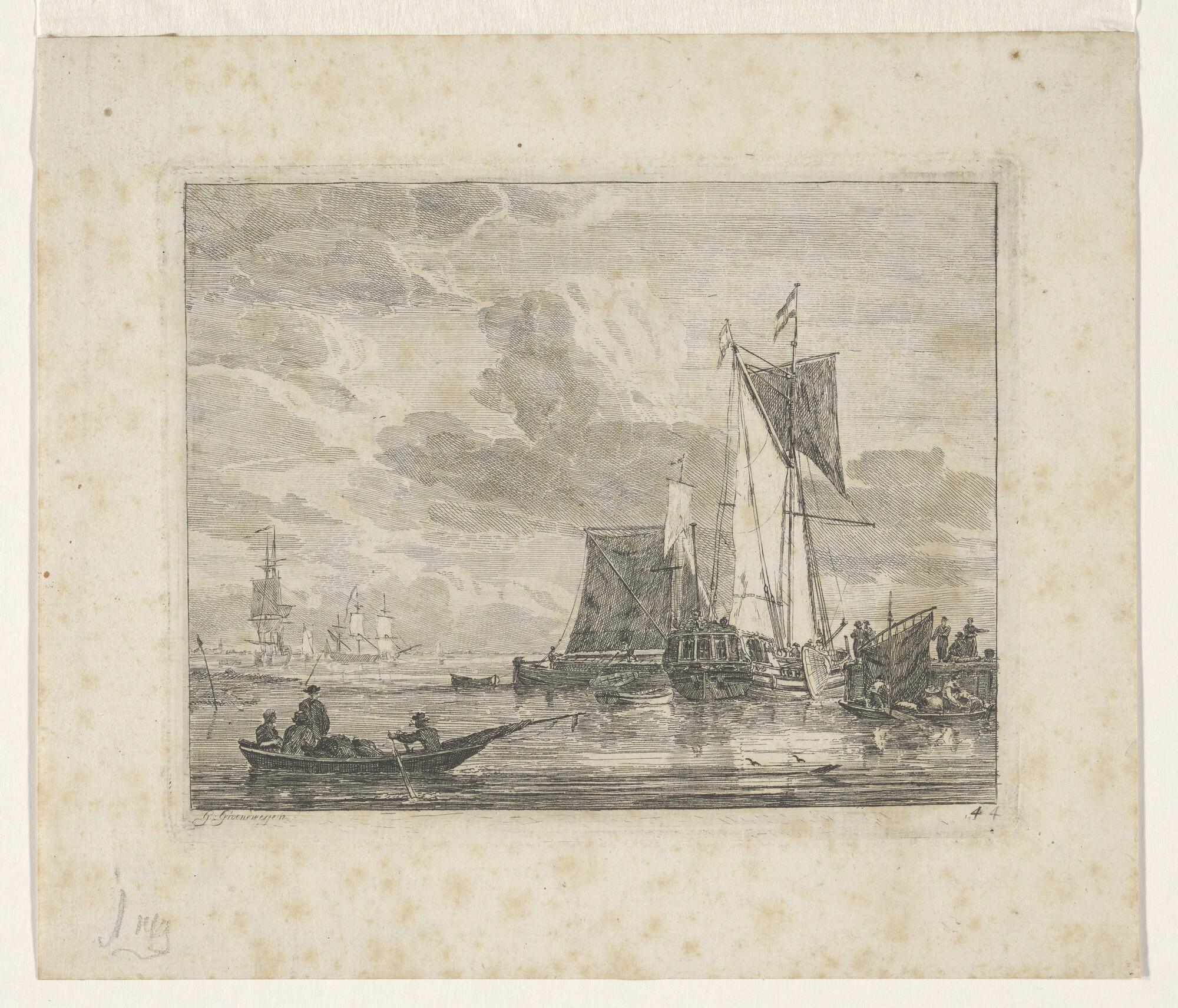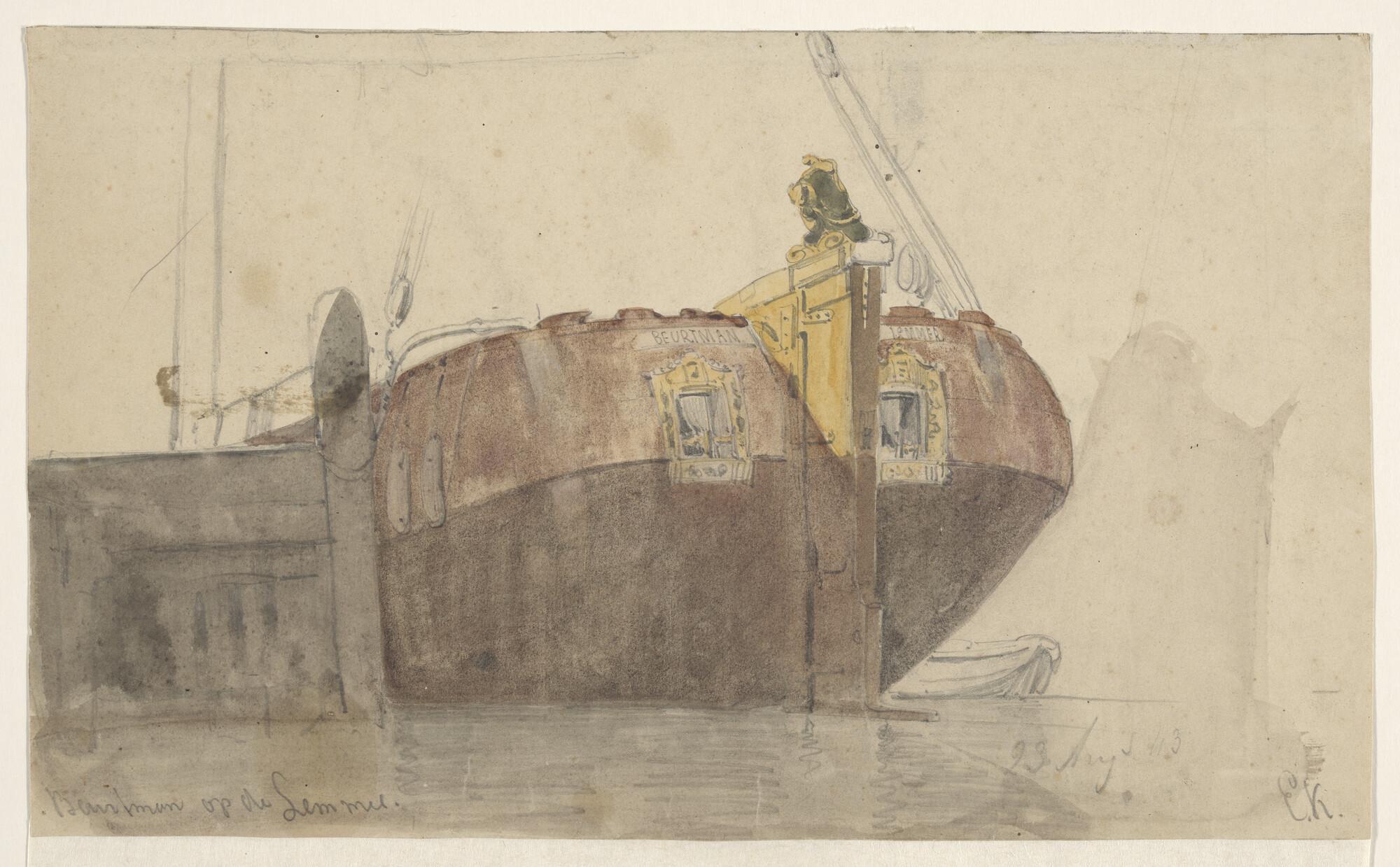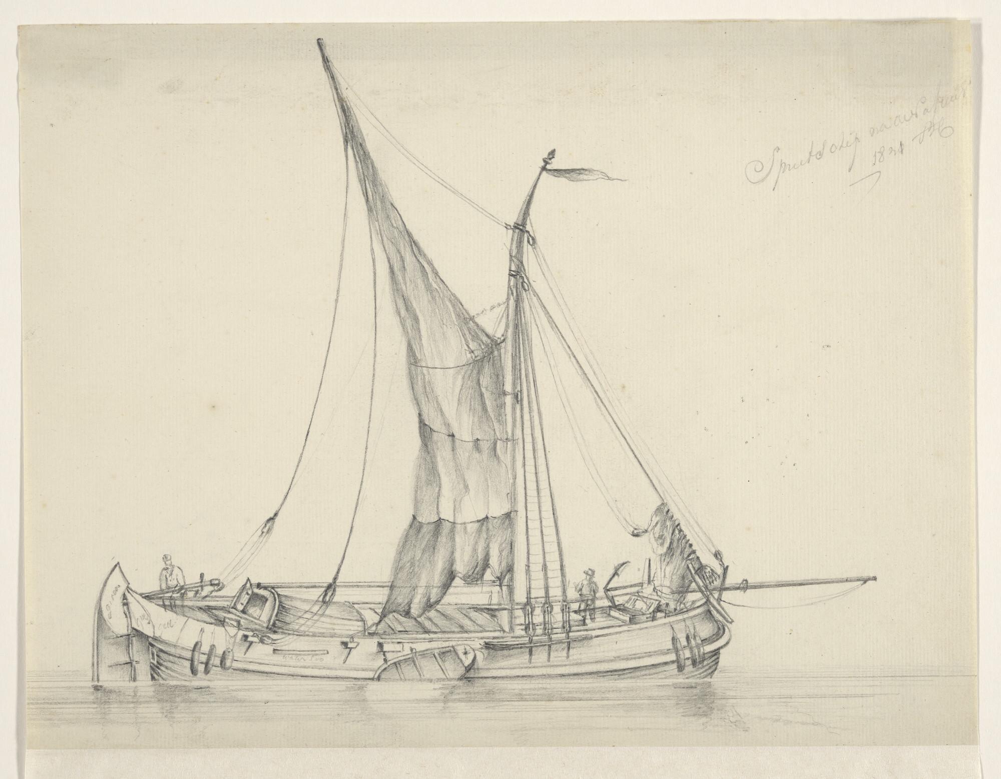 Een jacht en een binnenschip en verso: een krabbel