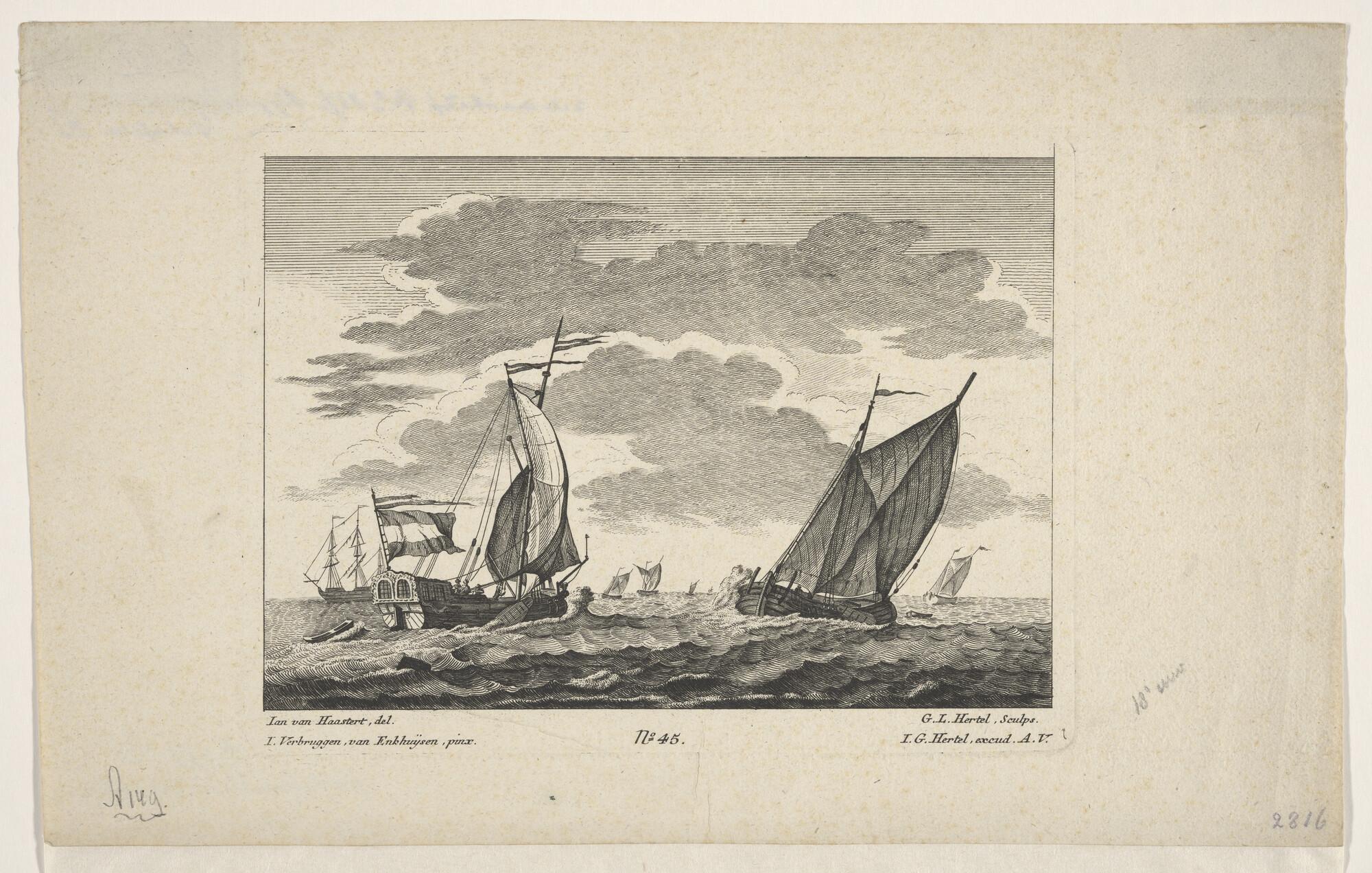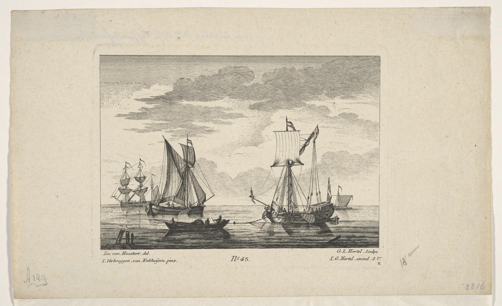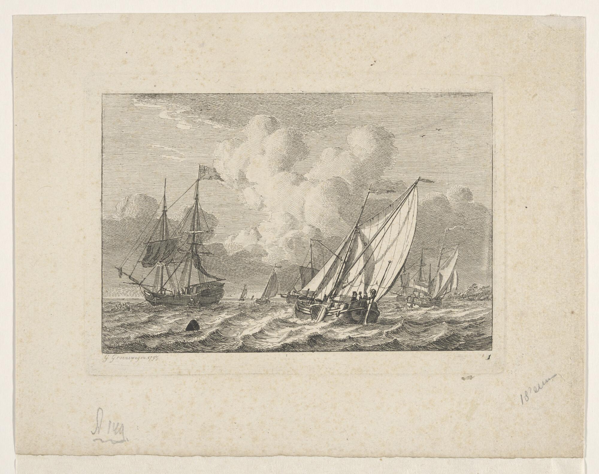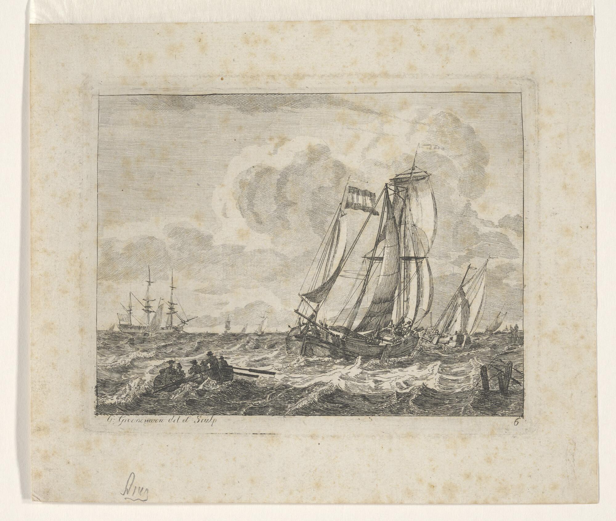 Een jacht en een binnenschip en verso: een krabbel