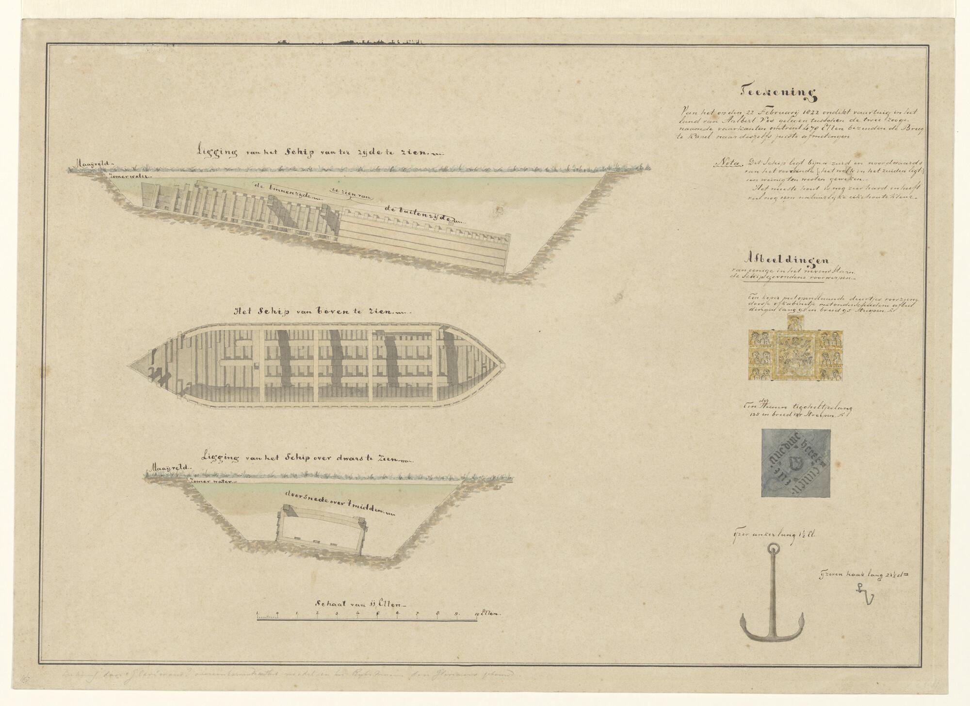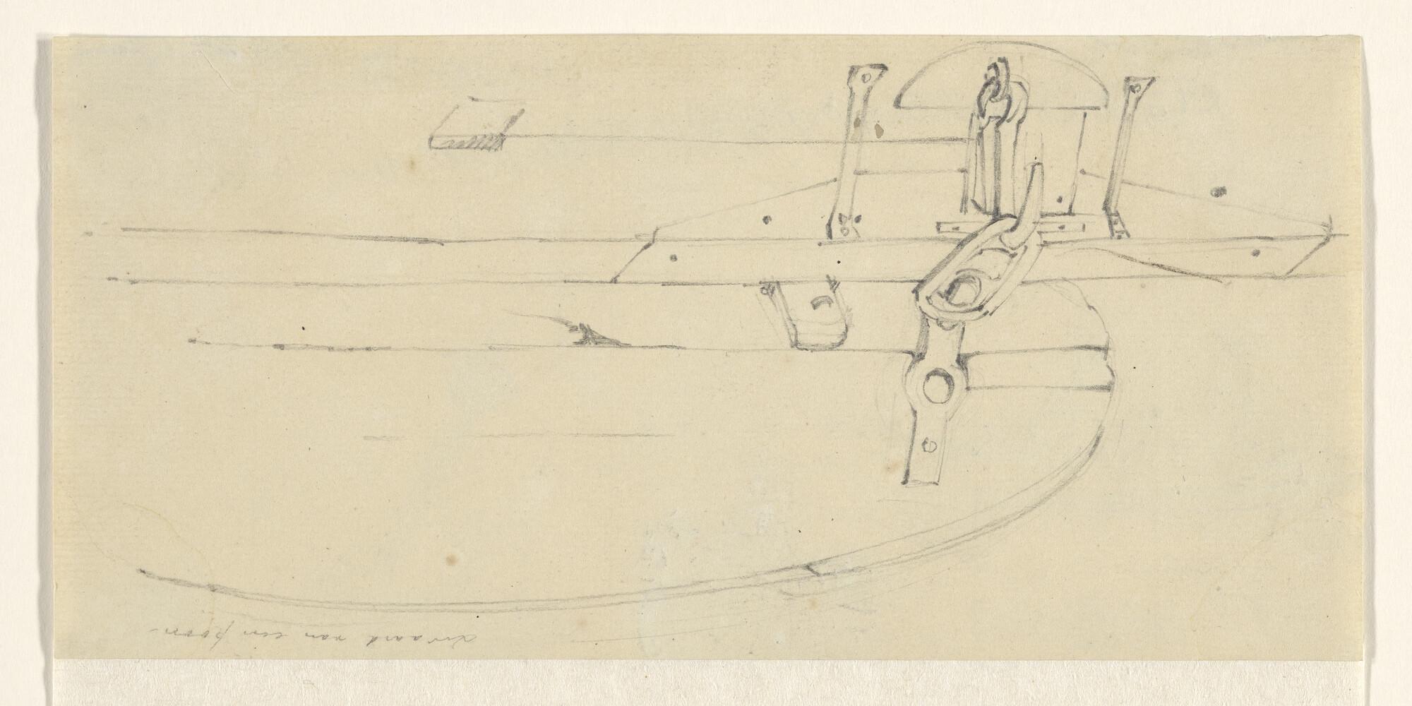 Het zwaard van een poon en verso een roeibootje en a...
