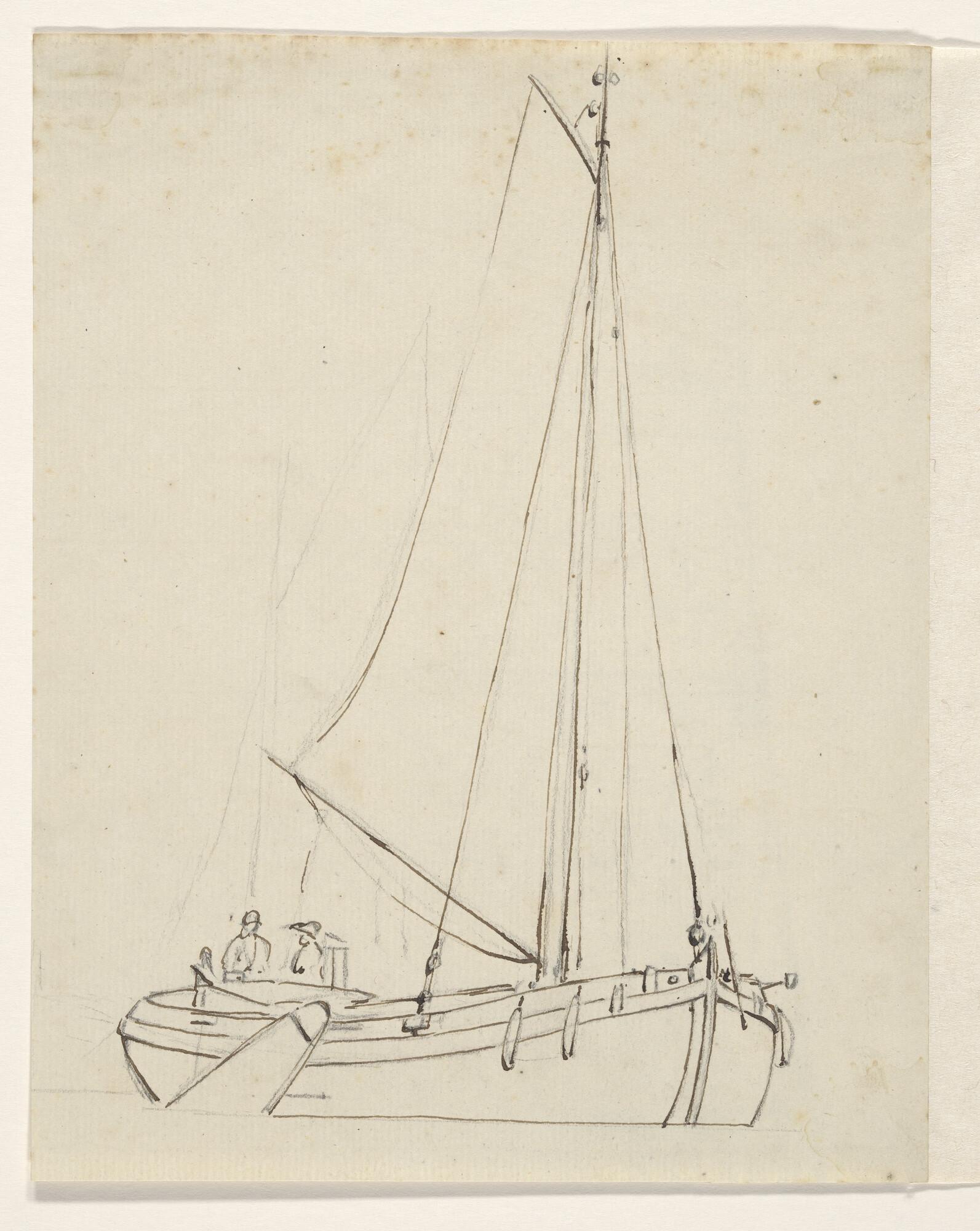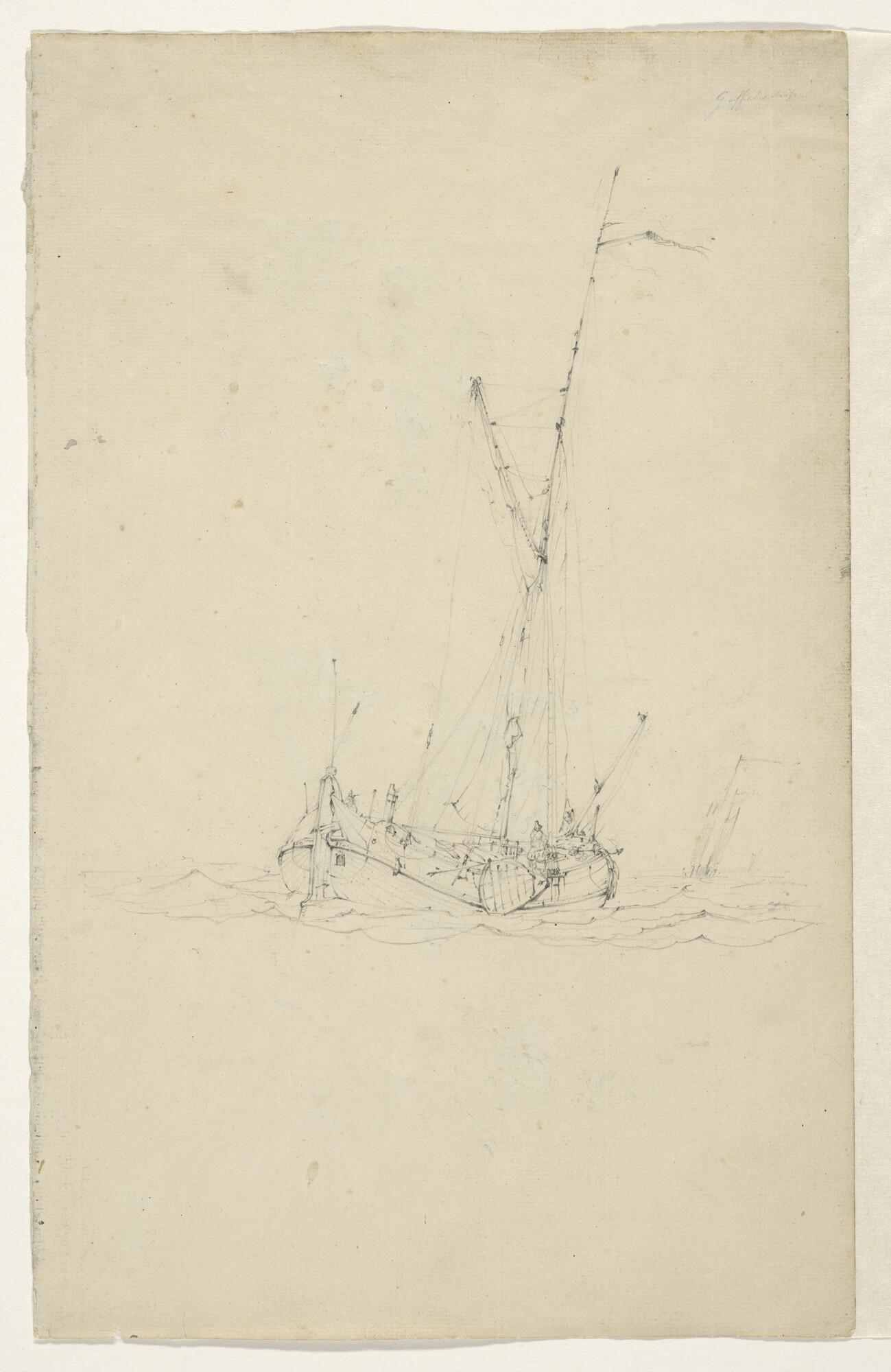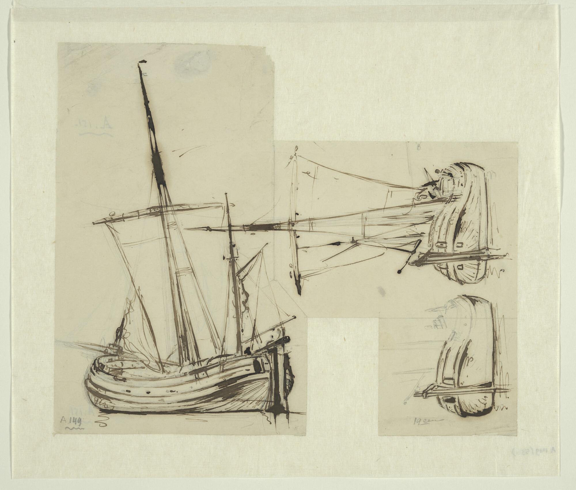 Een gaffelschip en verso studies van een molen en fi...
