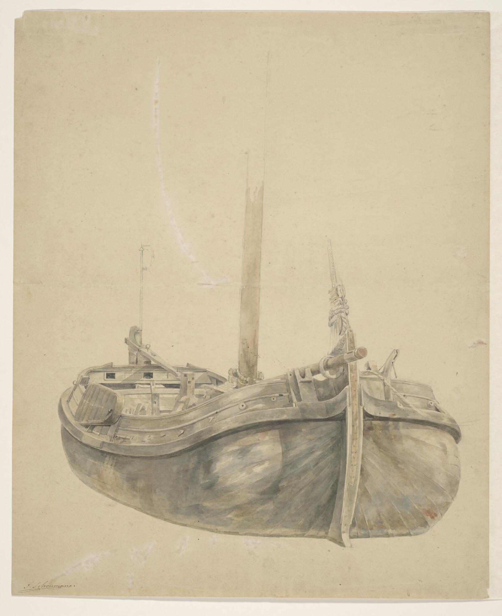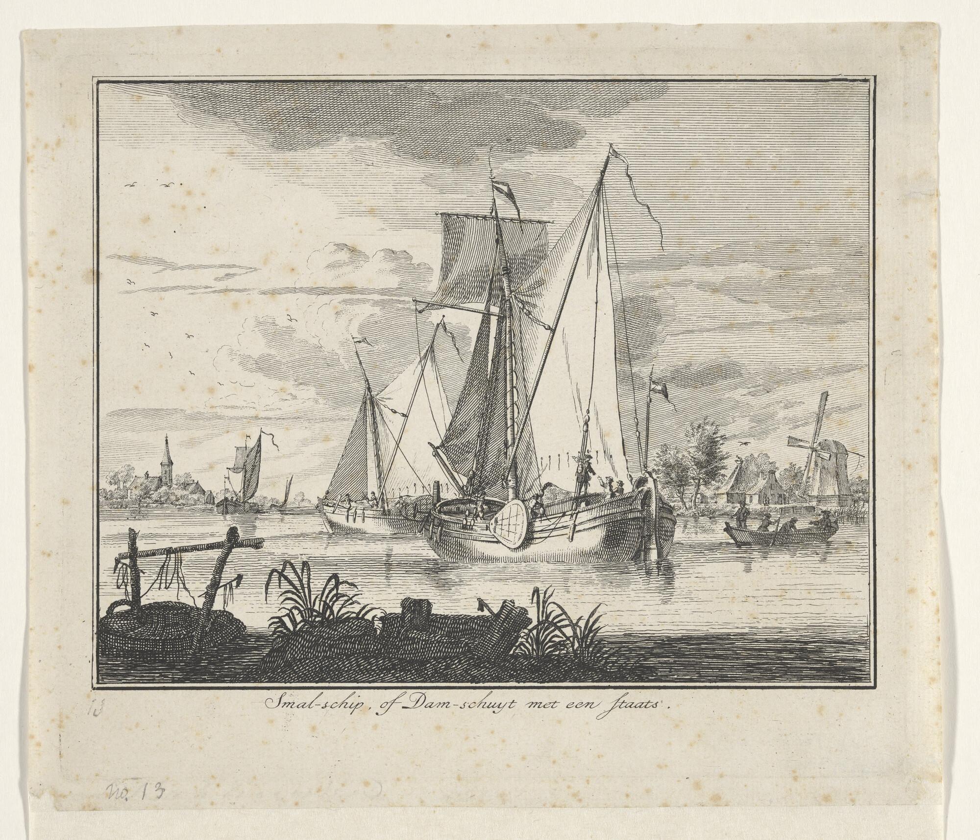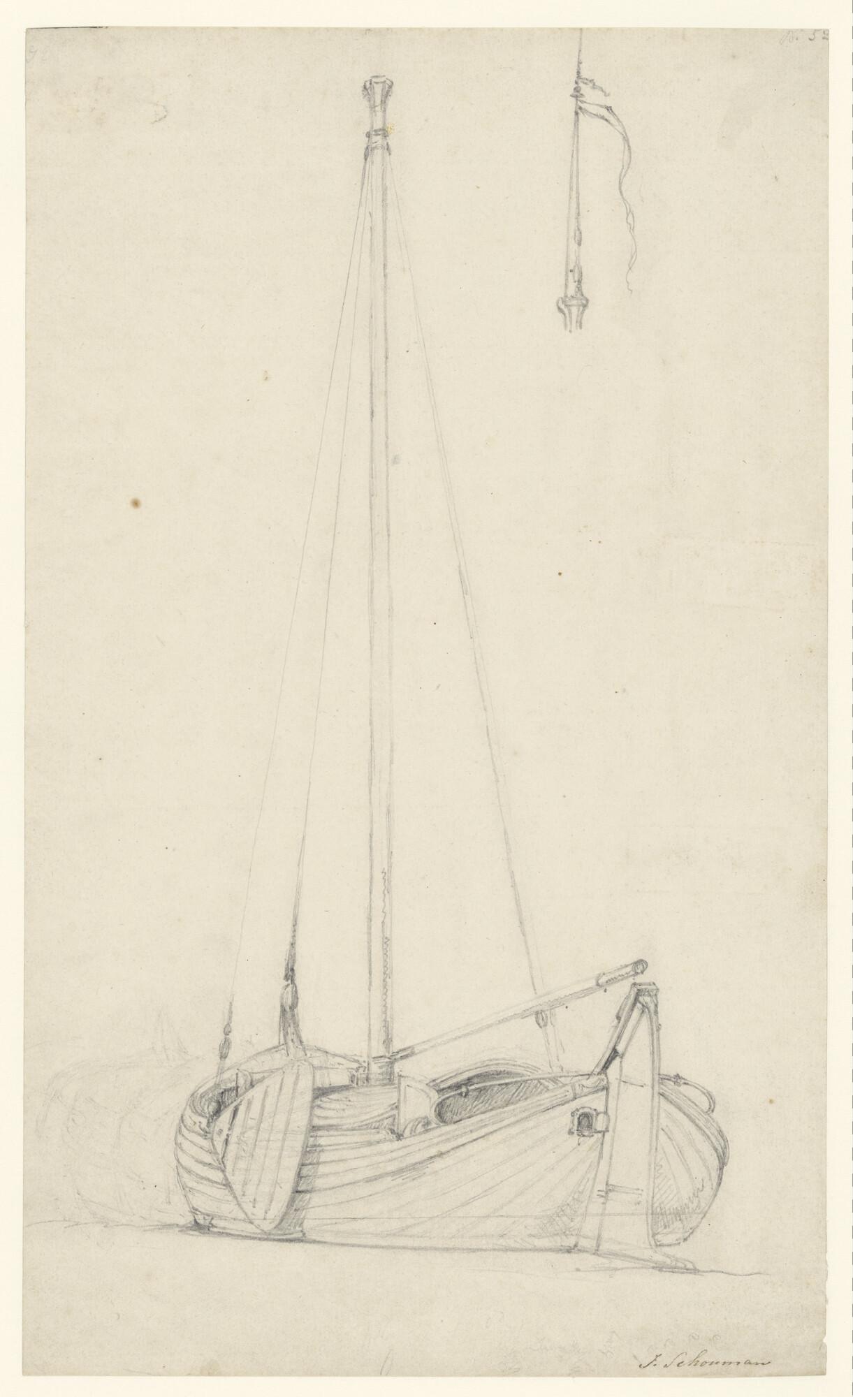 Een gaffelschip en verso studies van een molen en fi...