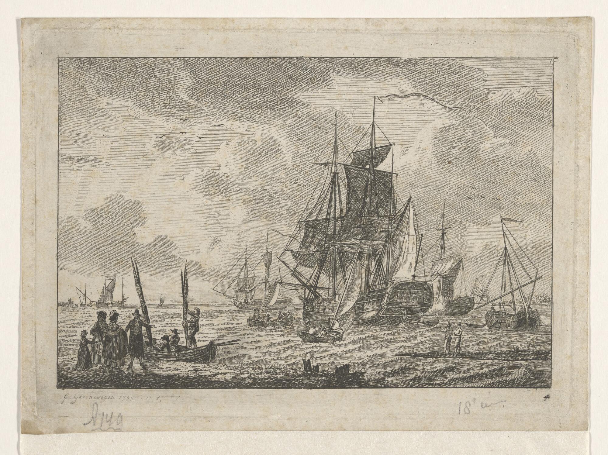 Prent van een fregatschip, voor anker liggende geeft...